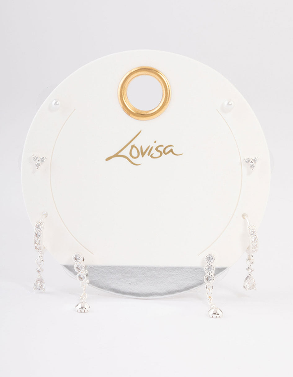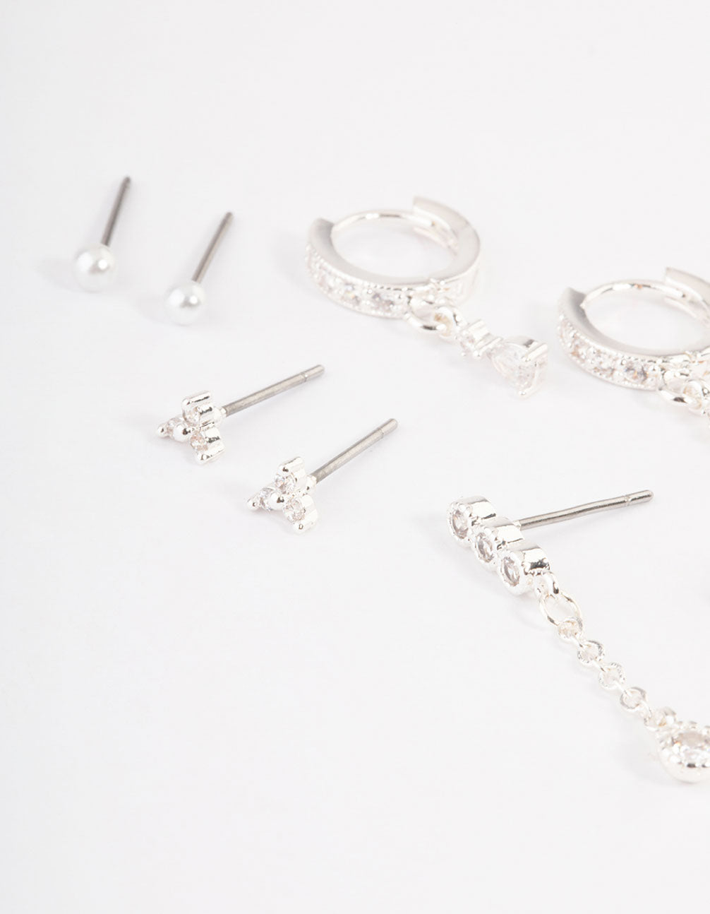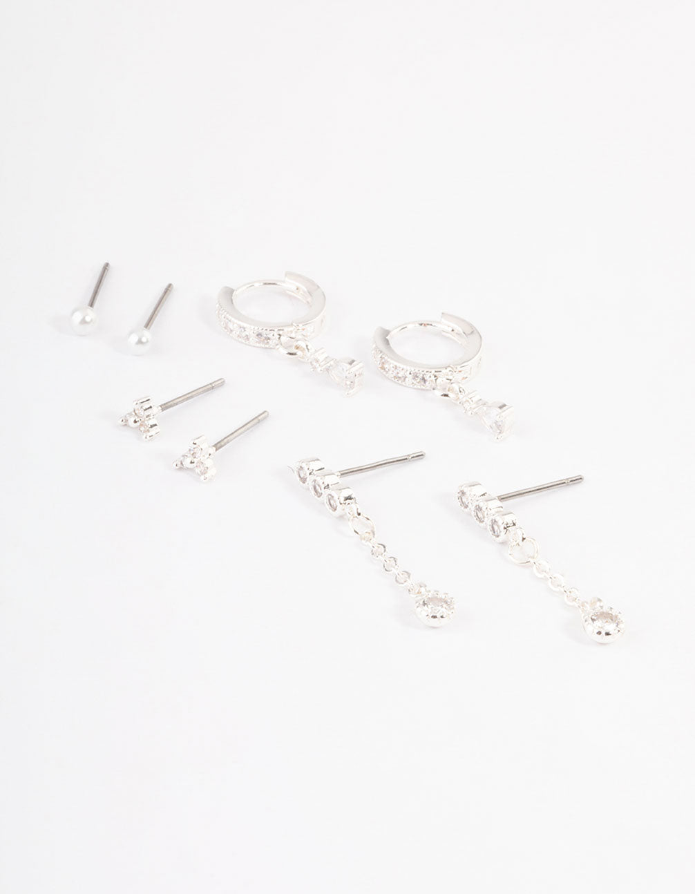 Silver Plated Cubic Zirconia Dainty Pearl Earrings 4-Pack