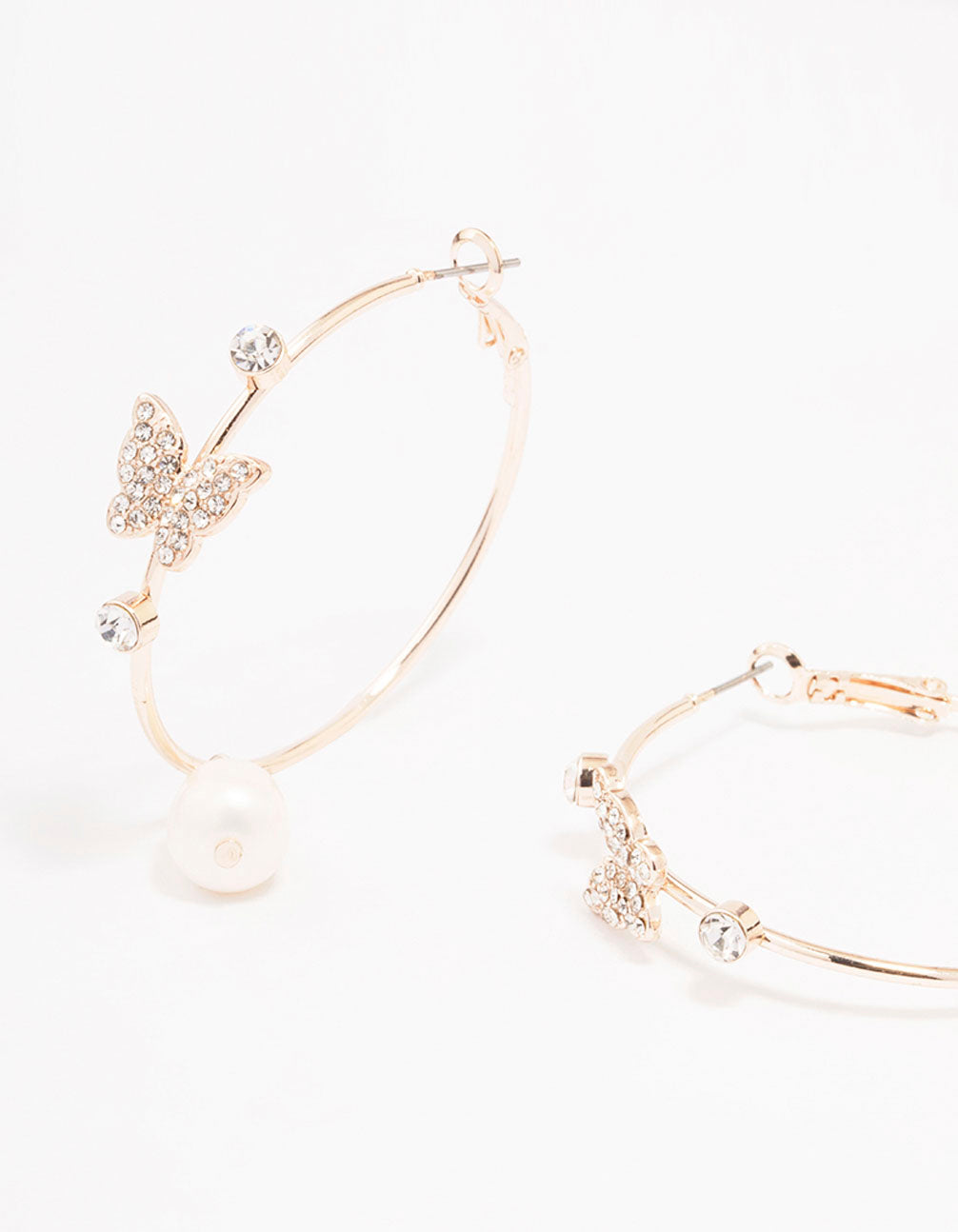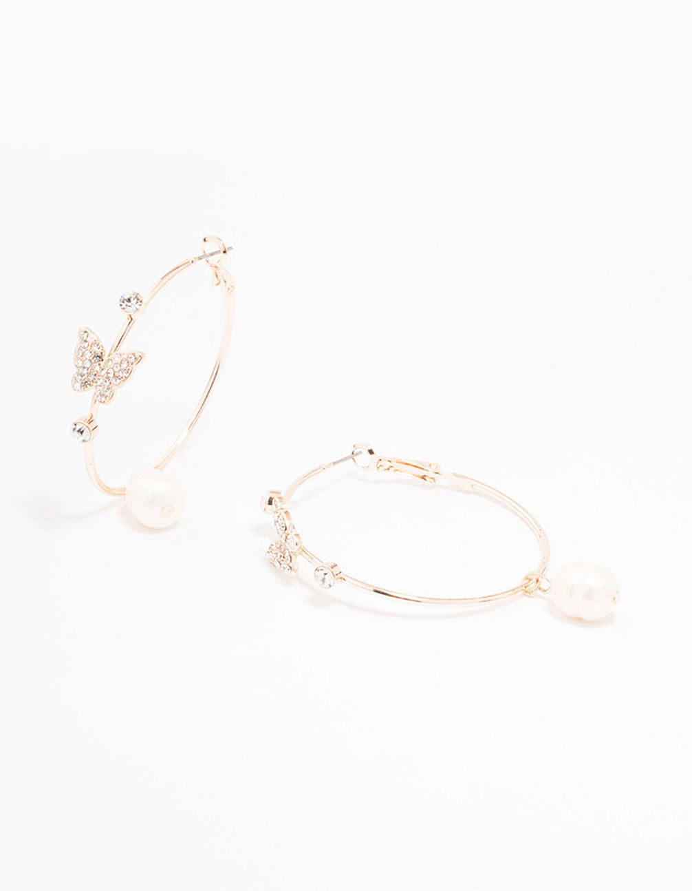 - These rose gold hoop earrings are embellished with elegant pearls that form a butterfly formation for a whimsical finish to your stack.