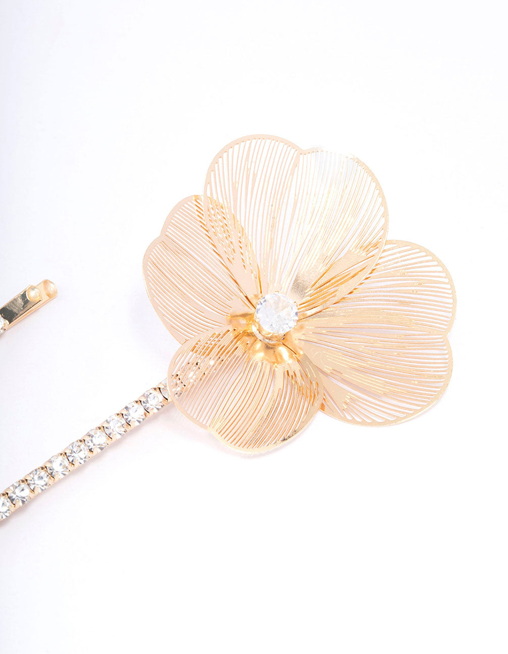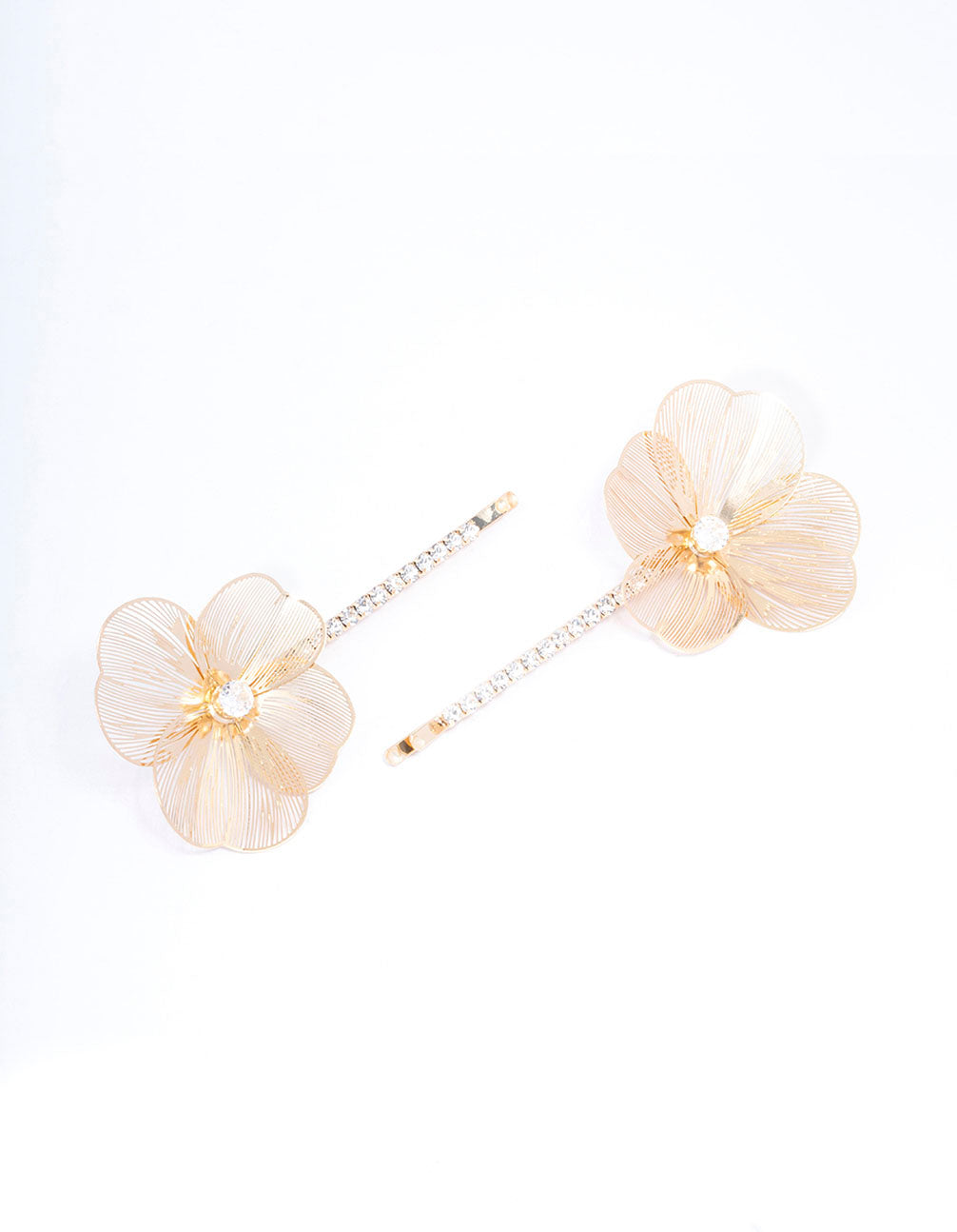 - This Gold Flower & Diamante Hair Clips 2-Pack includes two hair clips adorned with floral motifs and delicate diamantes, perfect for adding a luxe finish to your hairstyle.