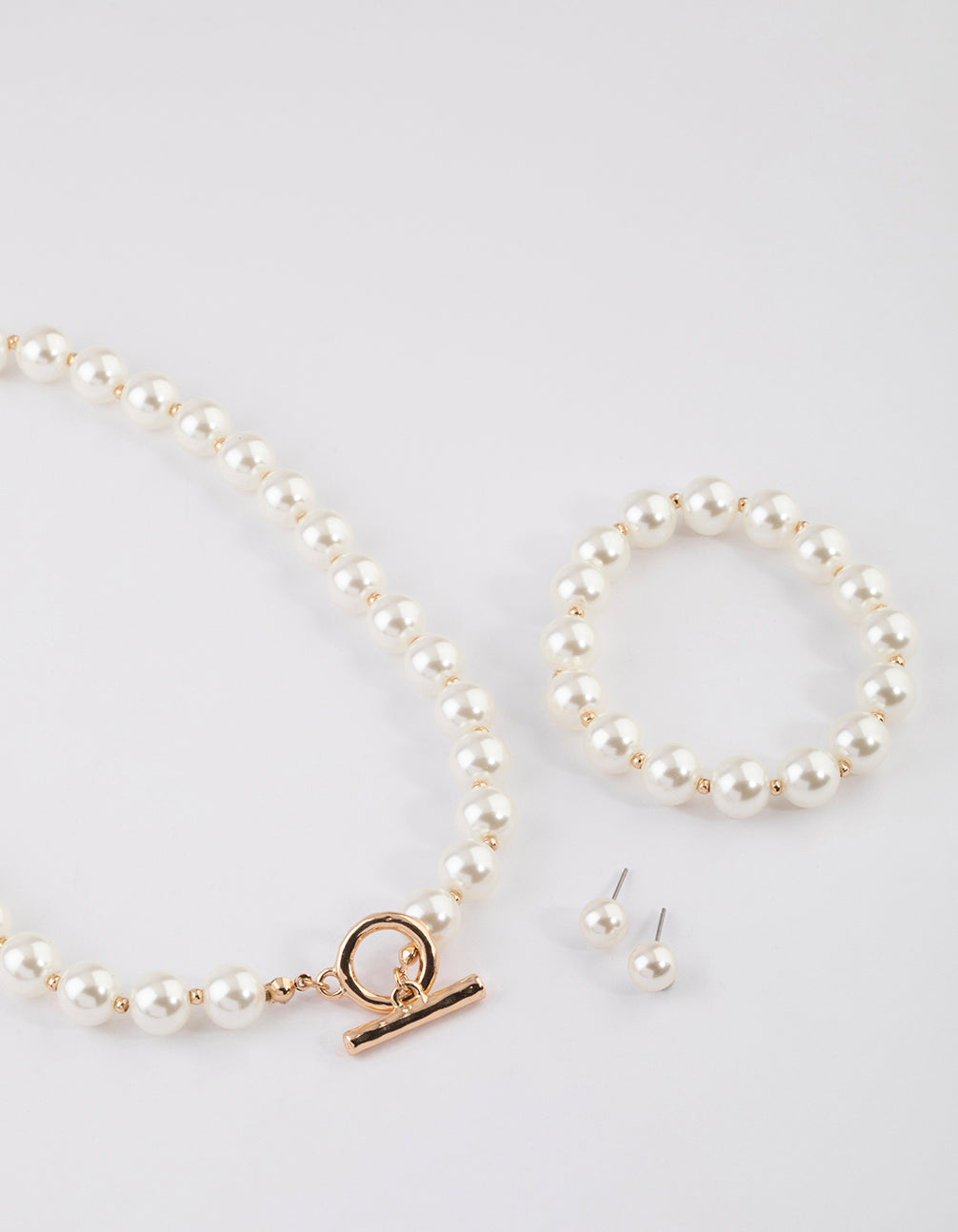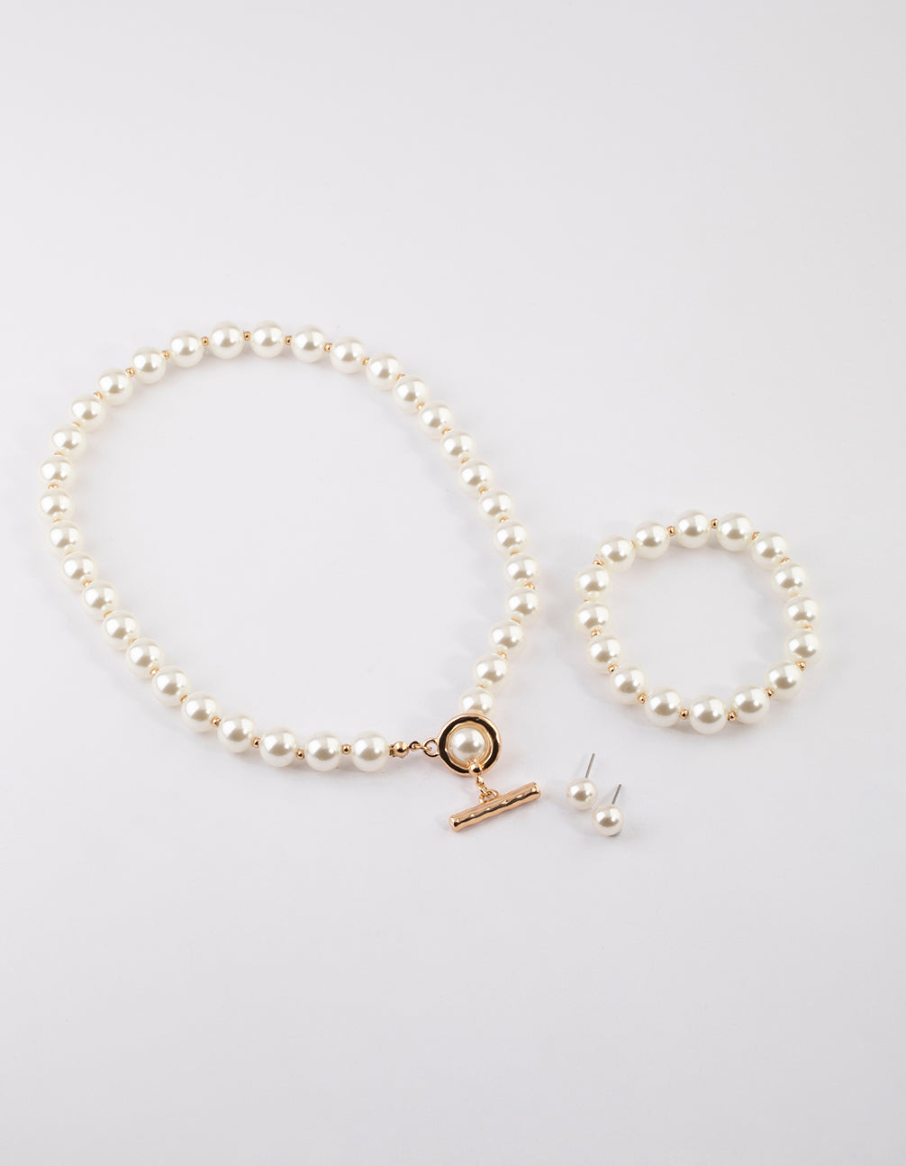 - This Gold Pearl Matching Jewellery Set includes a necklace, bracelet and pair of matching earrings adorned with delicate pearls. Embrace the beauty of nature with this elegant set, perfect for adding a sophisticated edge to your look.
