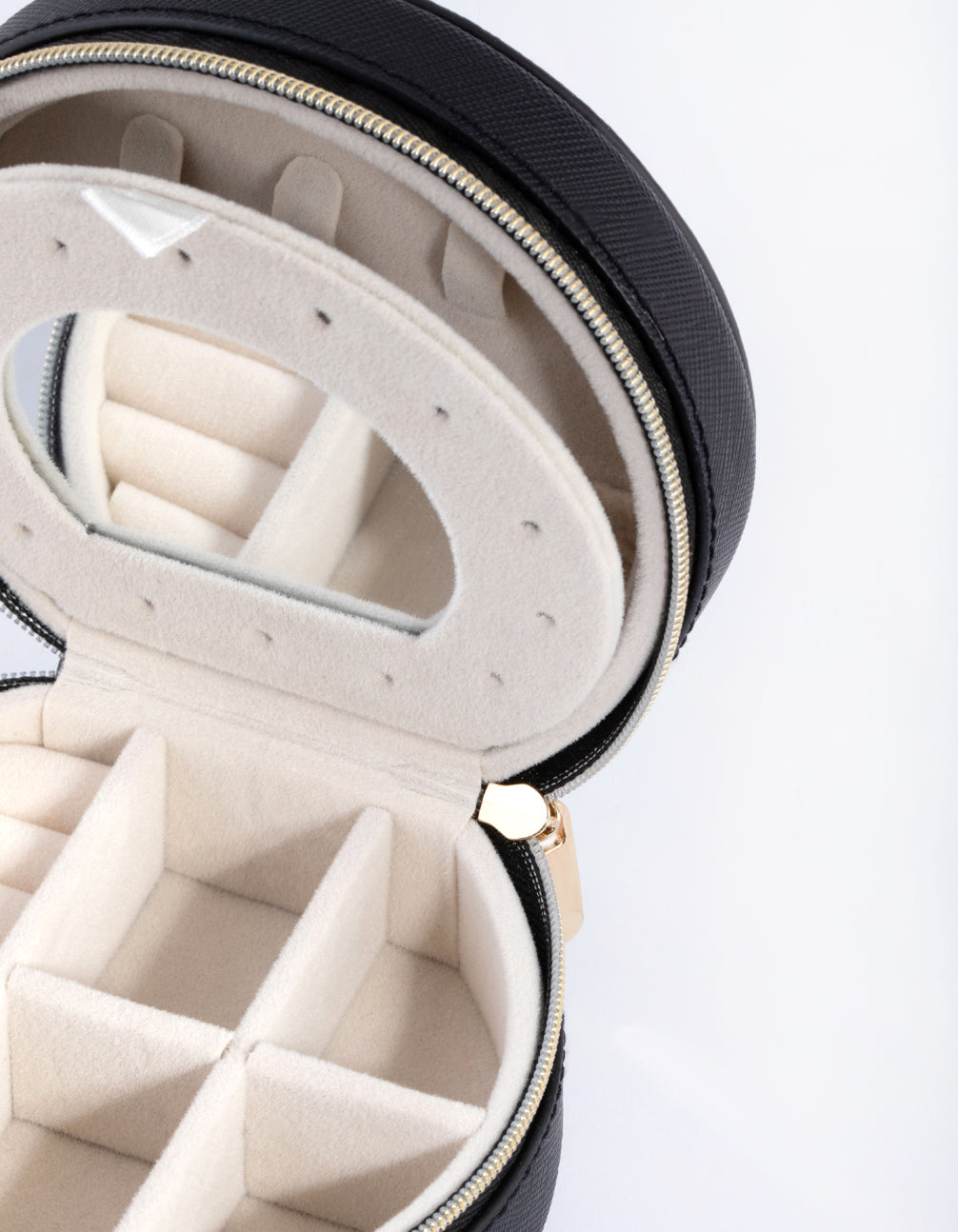 This jewellery box features a circular design with a compact mirror in the centre — perfect for accessorising on the go!