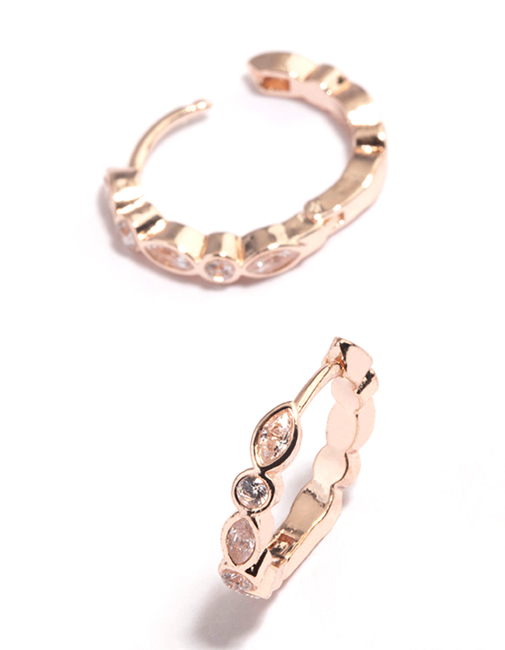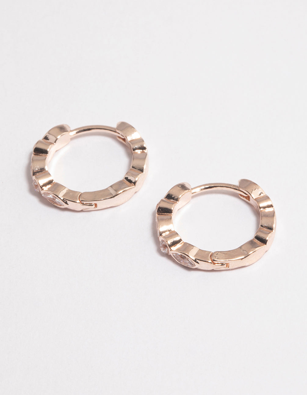 These rose-gold toned, diamante row huggie hoop earrings are designed to hug your earlobe for a minimalist look. Featuring delicate diamantes and a row design, these earrings are perfect for every occasion.