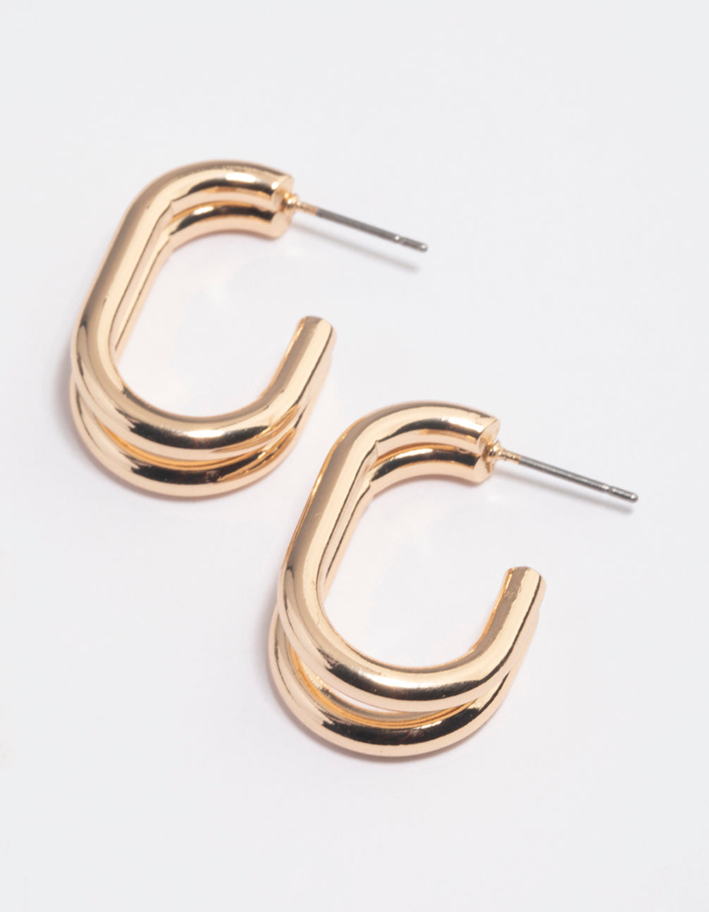The Gold Double Row Oval Hoop Earrings are a classic and elegant accessory that will never go out of style. They feature a double row of oval-shaped hoops that create a sophisticated and timeless look. The earrings are crafted with a gold setting, which gives them a polished finish that's perfect for any occasion.
