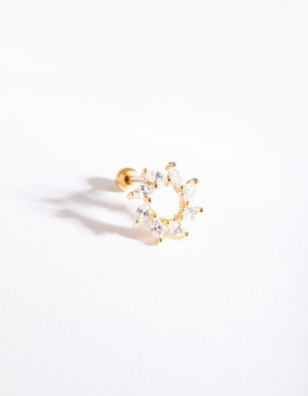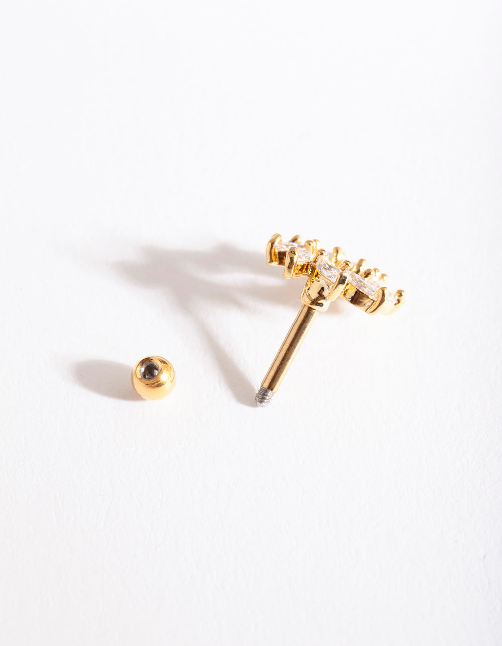 This gold-toned barbell boasts a diamante embellished sun design. It's got a surgical steel post, which makes it more gentle for daily use. It has a gauge of 16 and a length of 1.2mm.