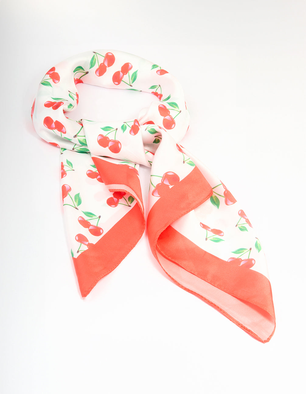 Add a cheeky twist to your look with this playful cherry-print scarf. Its fun fabric and sweet pattern bring a burst of stylish flair and a touch of whimsy to any outfit.