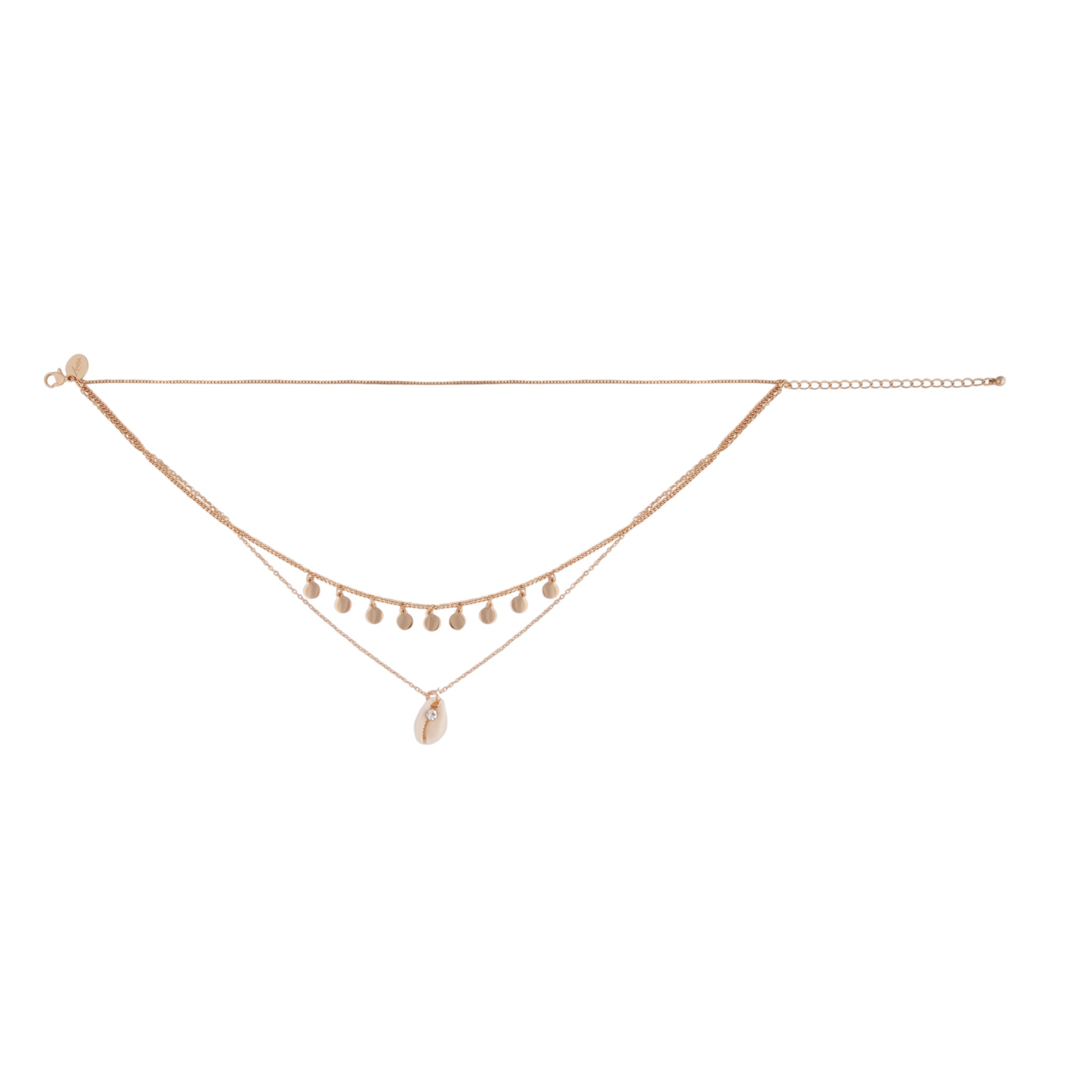 This choker necklace comes with a trio of gold-toned layers with a shell pendant.