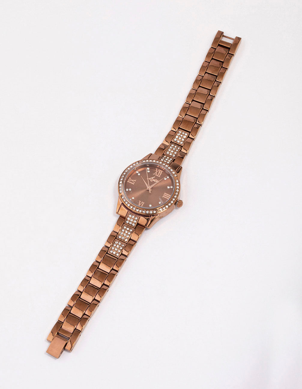This watch features a copper-coloured setting with delicate diamantes for a touch of glamour. Pair this watch with matching bracelets for a personalised touch.