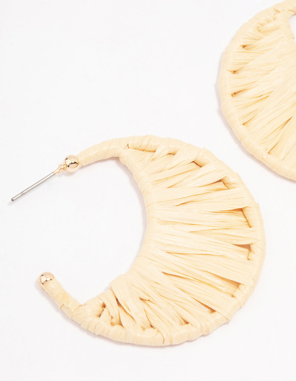 These unique hoop earrings feature a bold, crescent shape crafted from a cream-coloured fabric for a textural touch.
