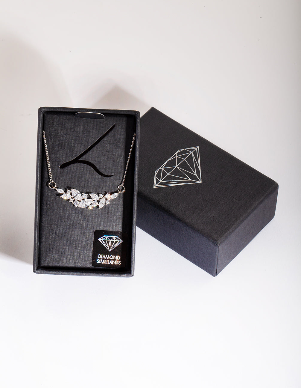 Diamond simulants are cut to be indistinguishable to the human eye from a real diamond, making them a luxurious addition to any collection. This necklace features a floral motif on a silver-toned setting.