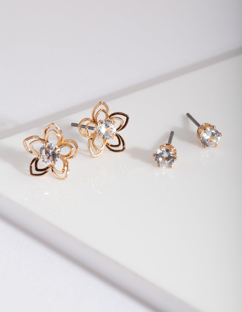Gold Cubic Zirconia Flower Stud Earring Pack
