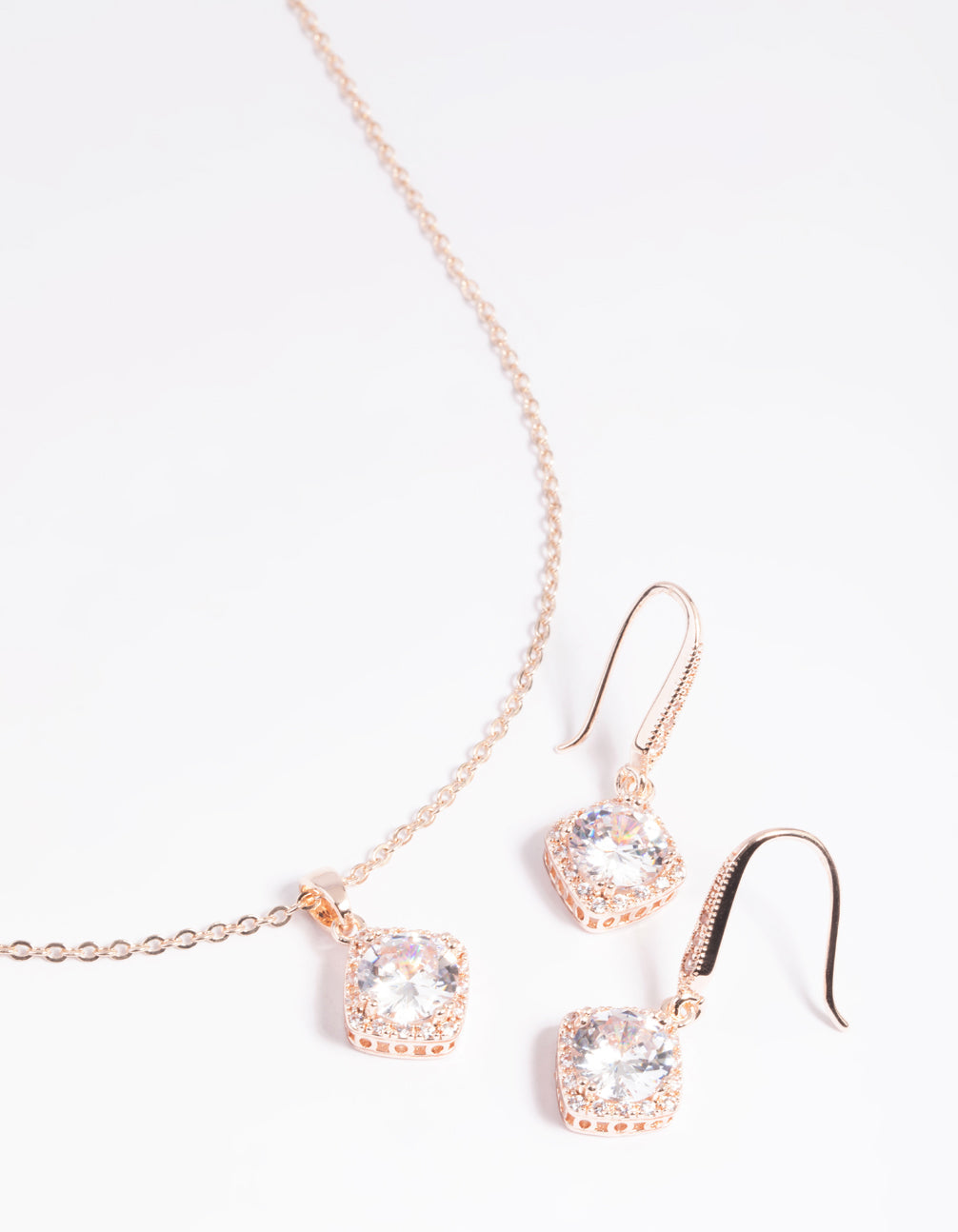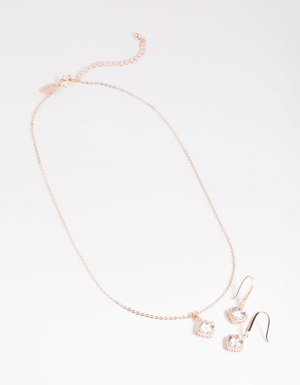 Rose Gold Cubic Zirconia Cushion Necklace & Earrings Set