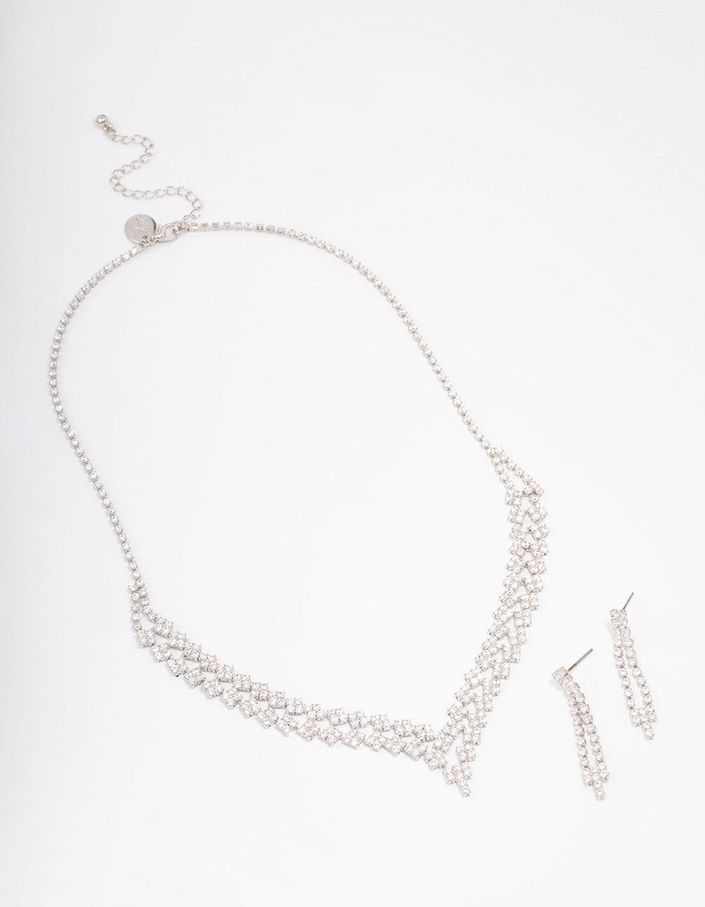 - This set includes a simple, layered cubic zirconia necklace and a pair of drop earrings to match. Complete your ensemble with this coordinated set, perfect for special occasions.