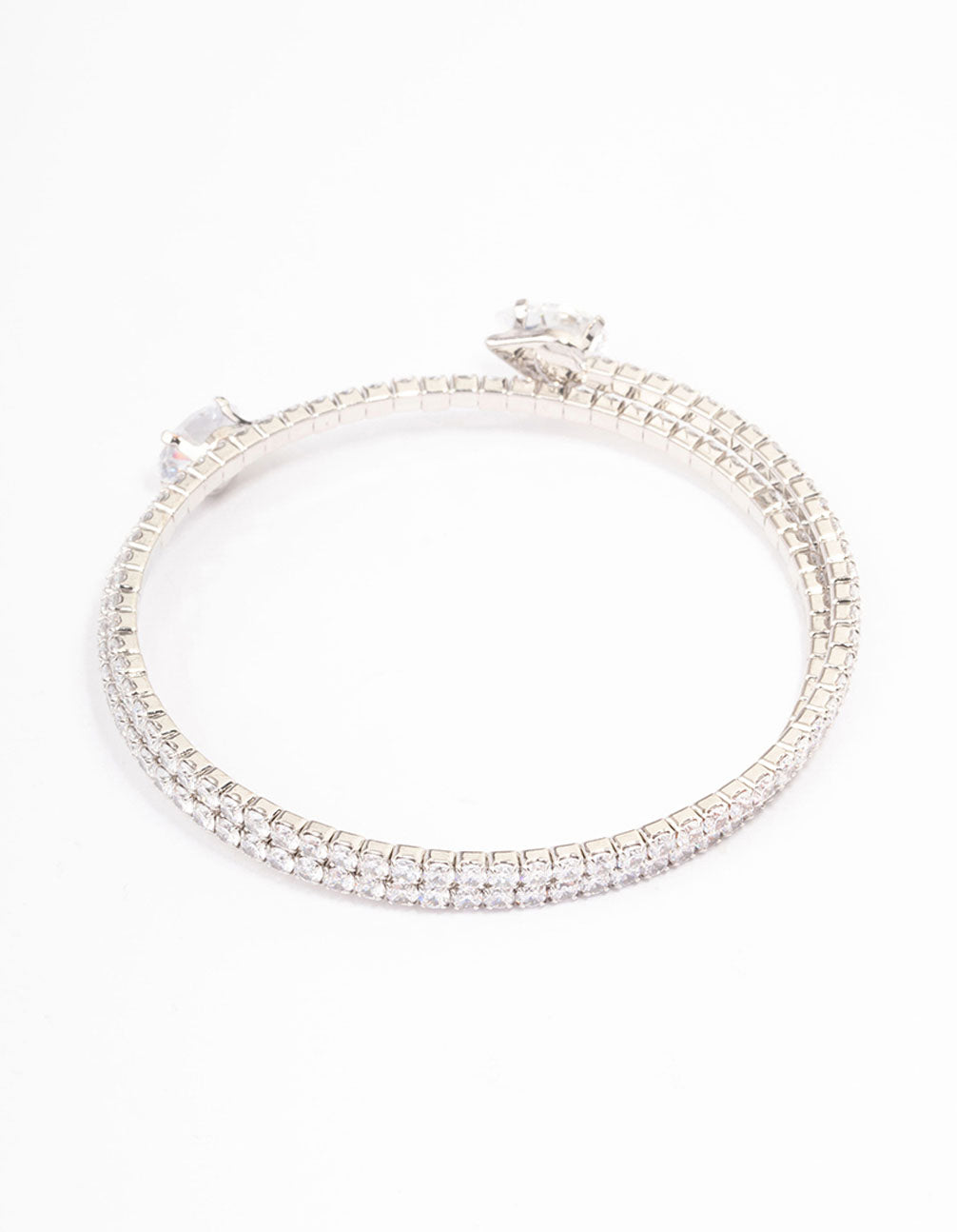 • This bangle features a chic silver setting with double-pointed cubic zirconia stones for a modern and sophisticated look. Style this bangle with a simple crystal tennis bracelet for a stylish, stacked look.
