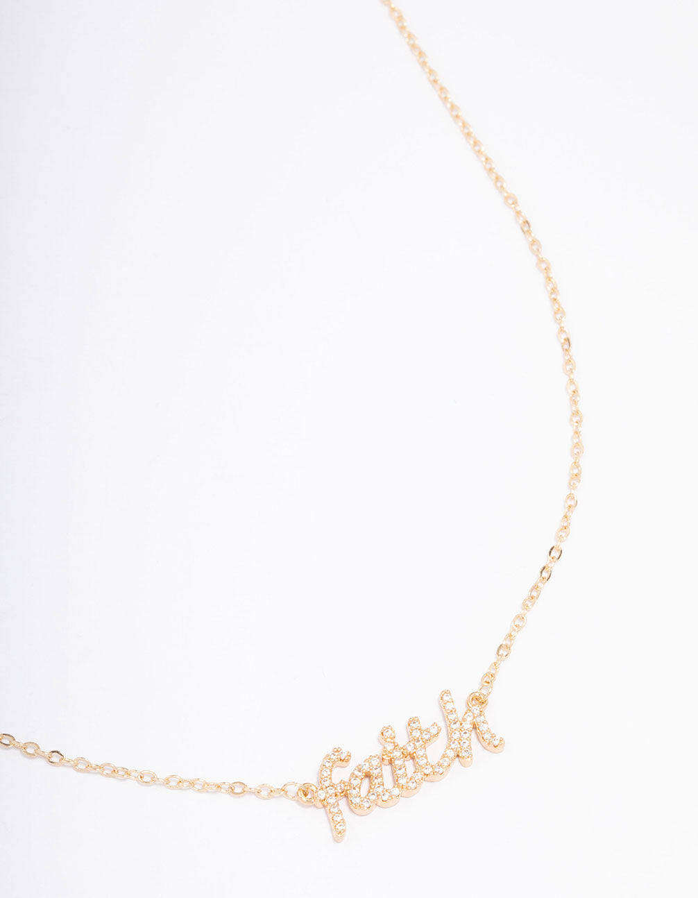 - This script pendant necklace features a timeless gold setting that spells the word ‘faith.’ Pair this simple pendant with a set of simple diamond studs for a polished and understated look.