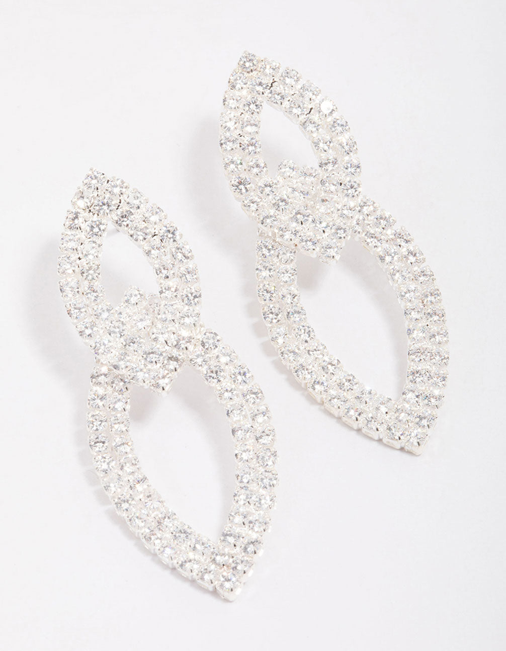These silver-toned drop earrings feature a double-layered effect, embellished with delicate crystals, perfect for styling with an evening look.