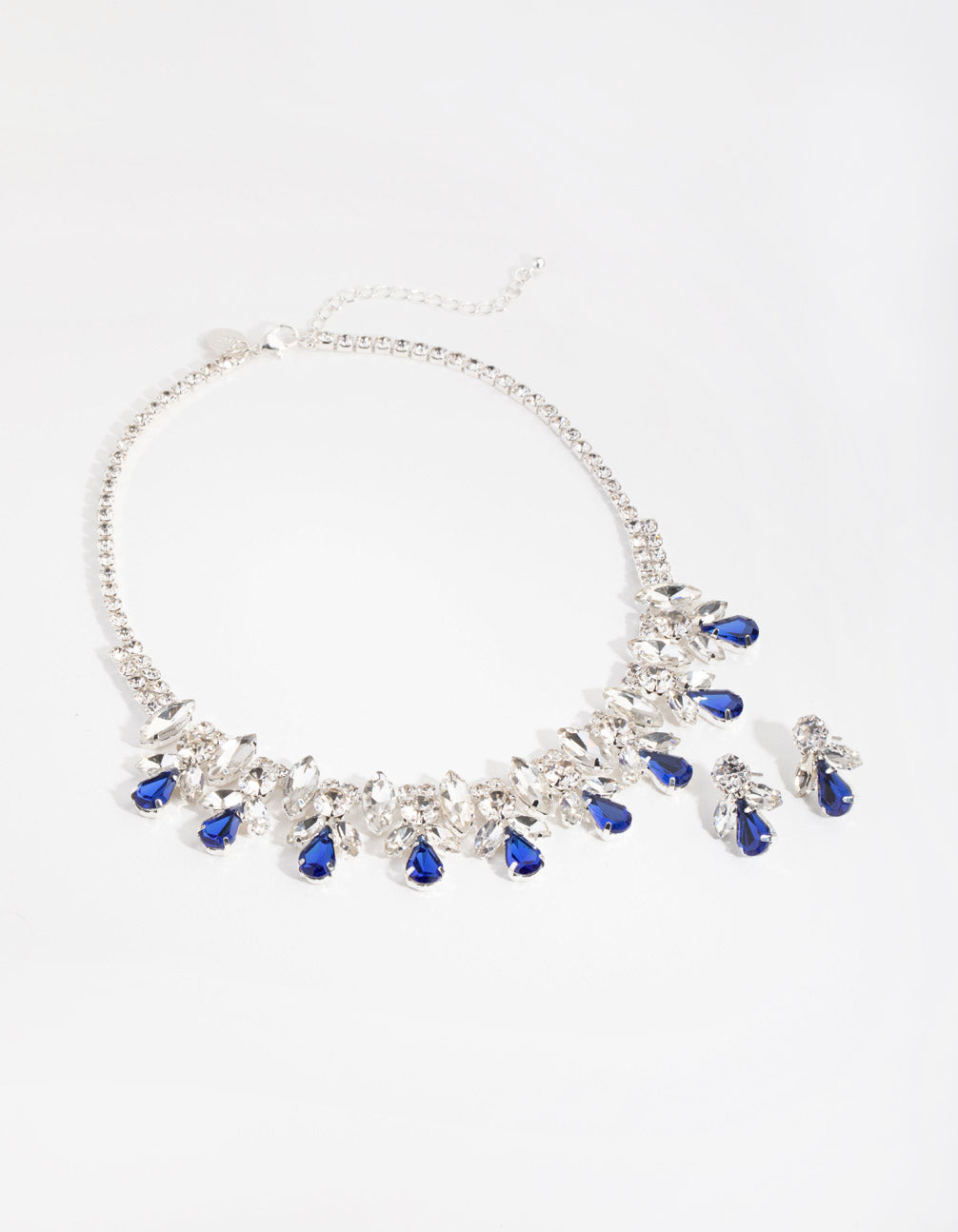 Sparkle and shine with glamorous, 1920s-inspired jewellery. This silver-toned necklace features teardrop-cut, sapphire-blue embellishments which are arranged in a station configuration around chunky diamante stones for extra sparkle. It comes with a matching pair of studs to complete the look. Wear them to make colours pop, or pair them with black for a sophisticated evening look. Very Gatsby!