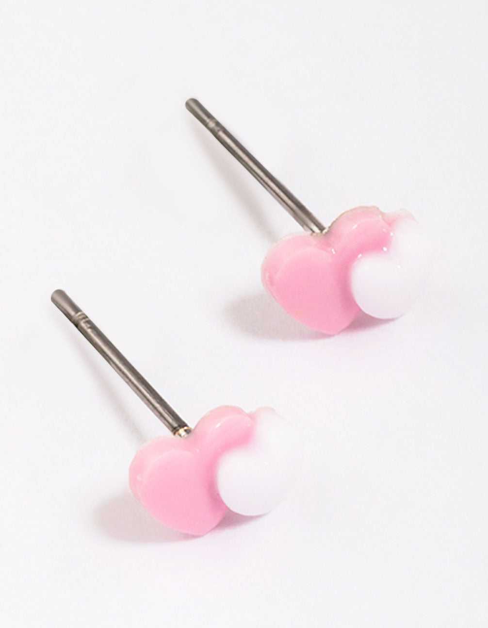 Add a lovable touch to your stack with these simple heart studs. These stud earrings feature two mini pink love hearts, designed with a graduating white heart in the centre.