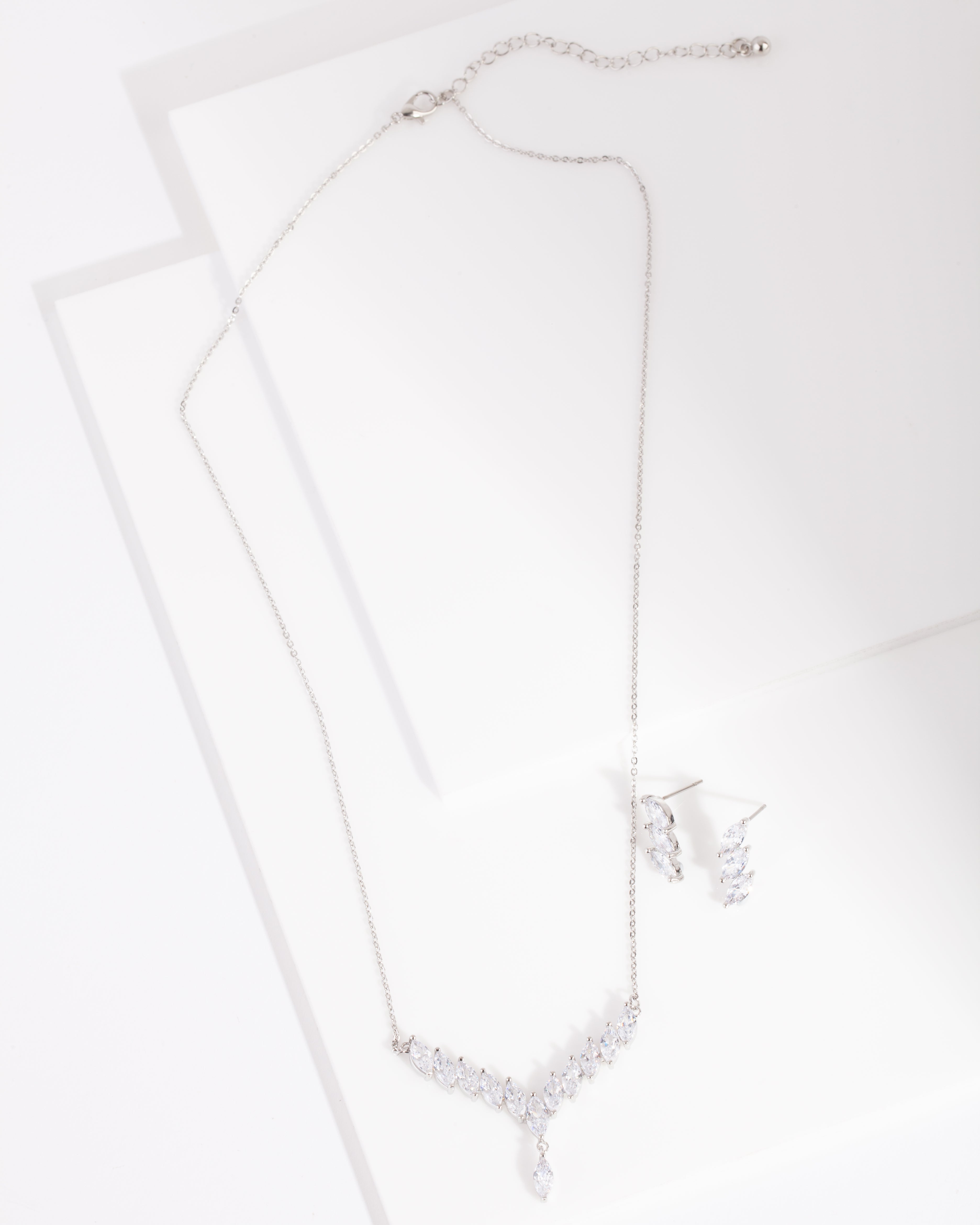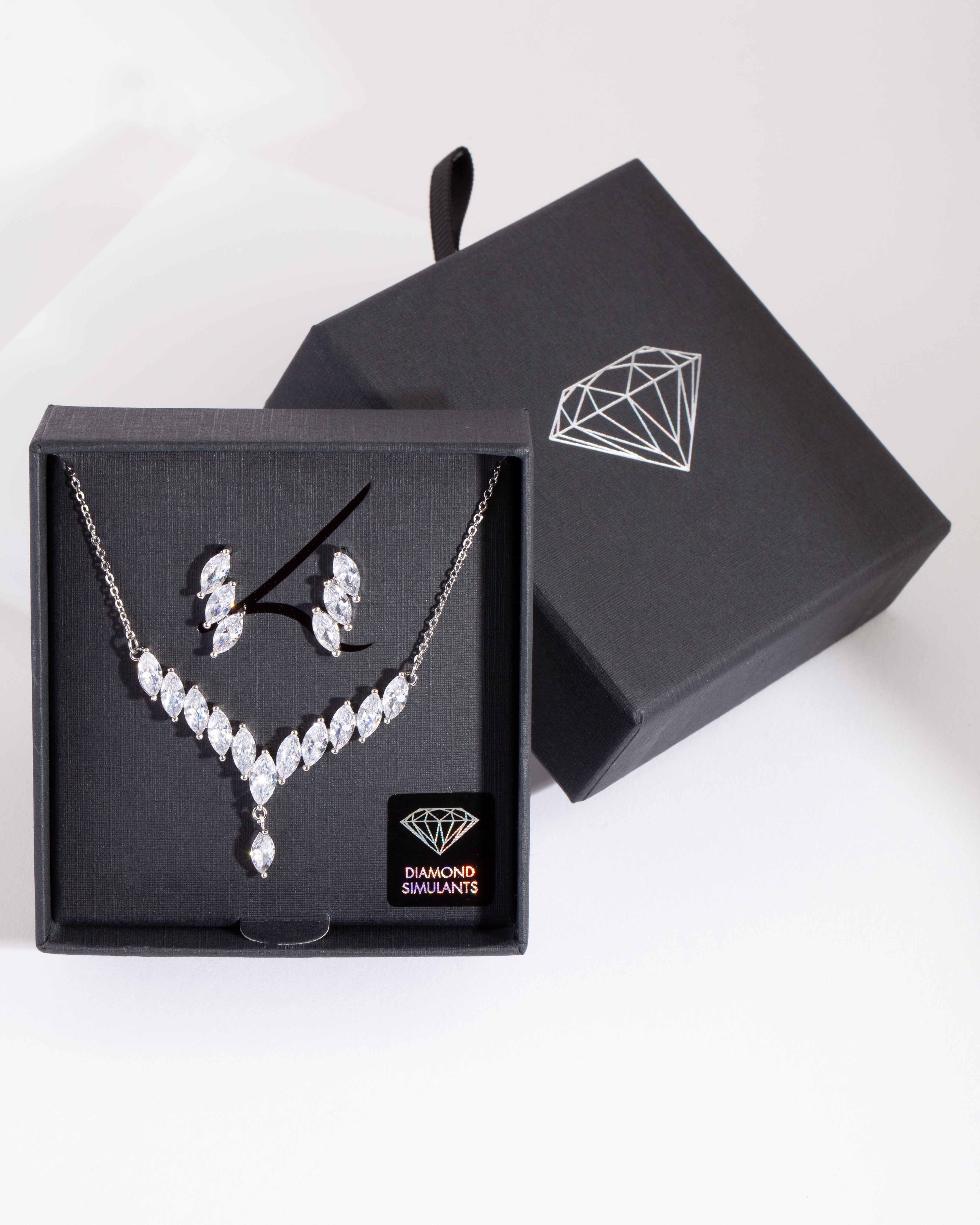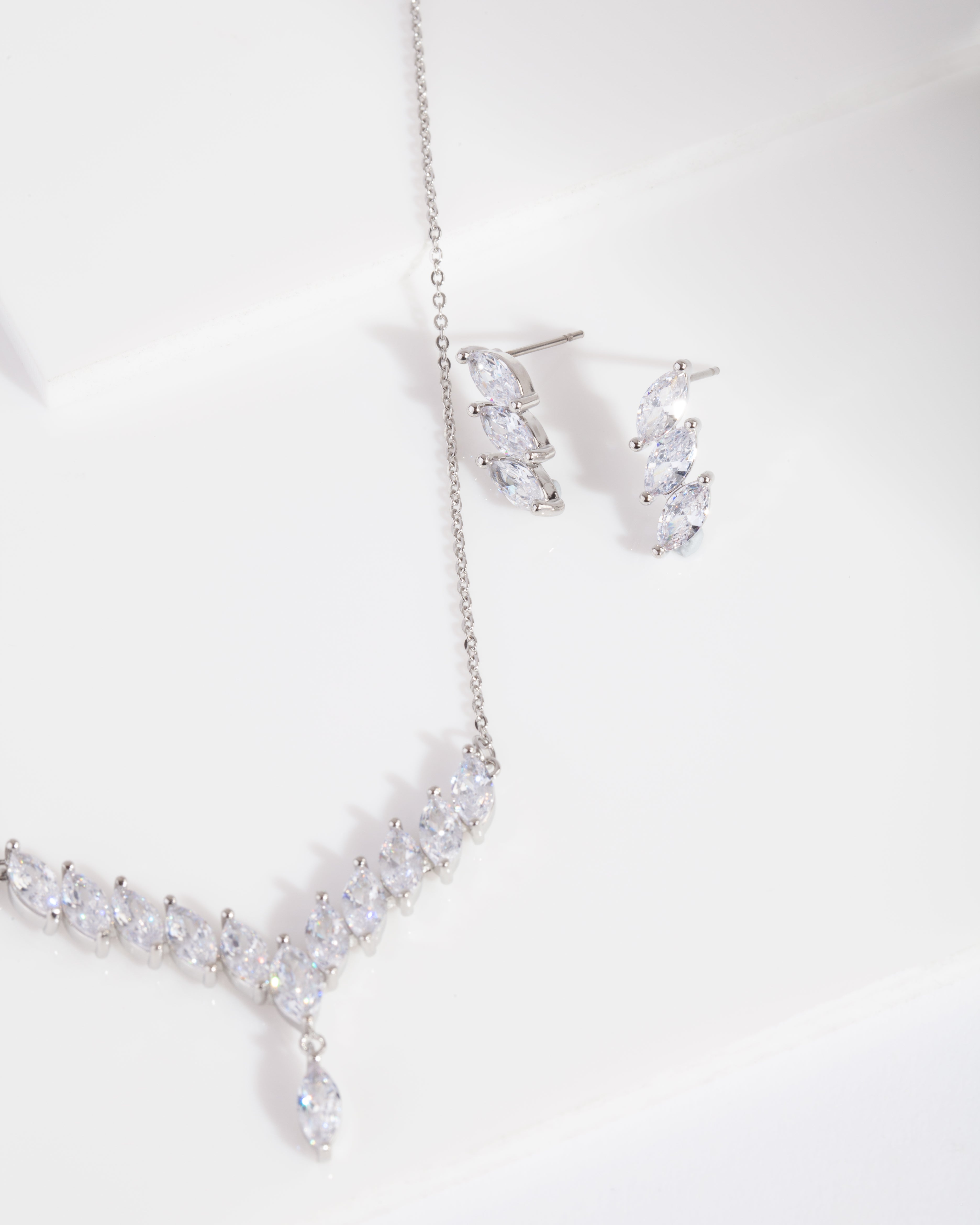 Lovisa diamond simulants are cut to be indistinguishable to the human eye from a true diamond. This silver-tone jewellery set features a row of slanted cut stones in a stud and necklace style.
