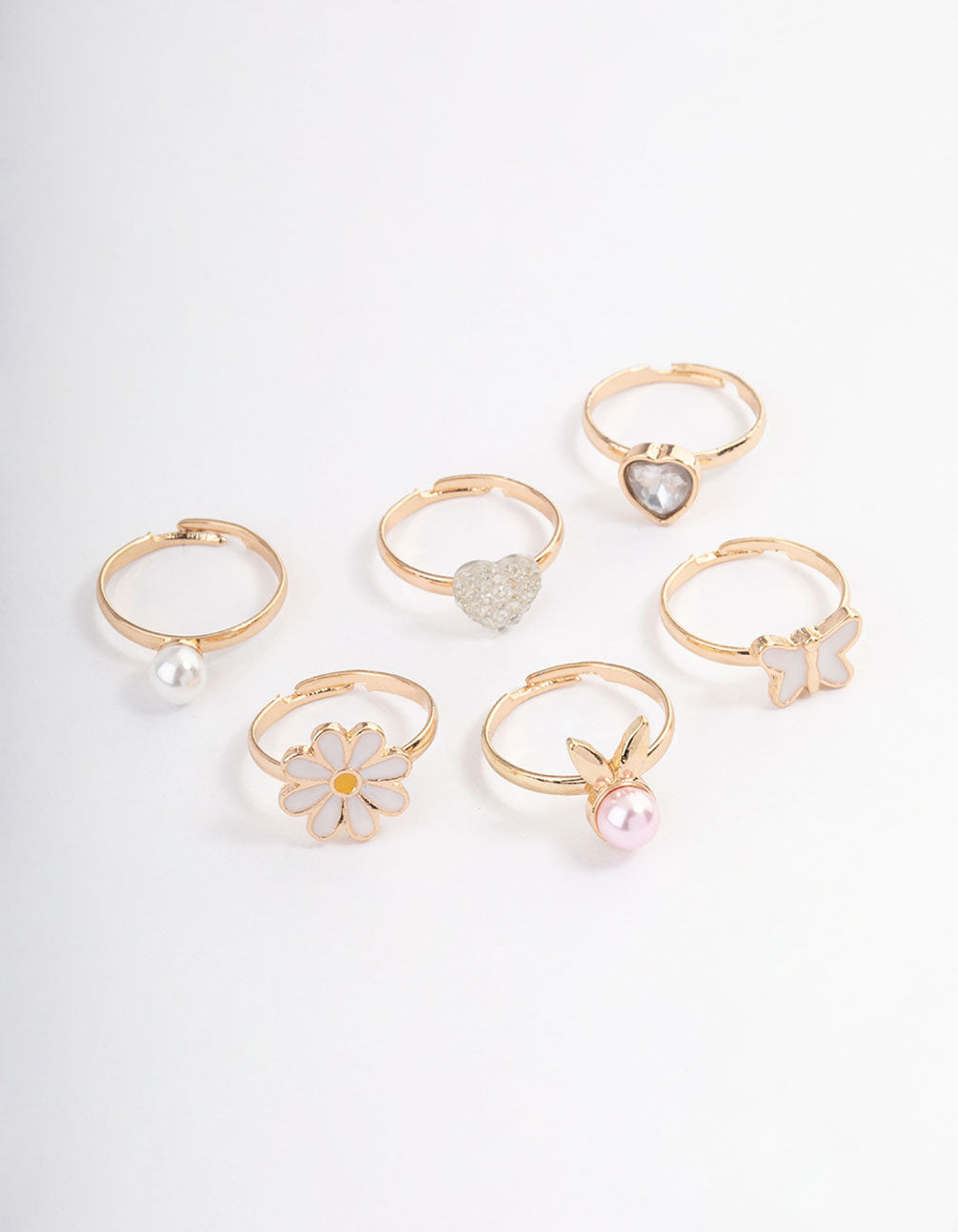 - This ring pack features six individual bunny and pearl motif motif rings.