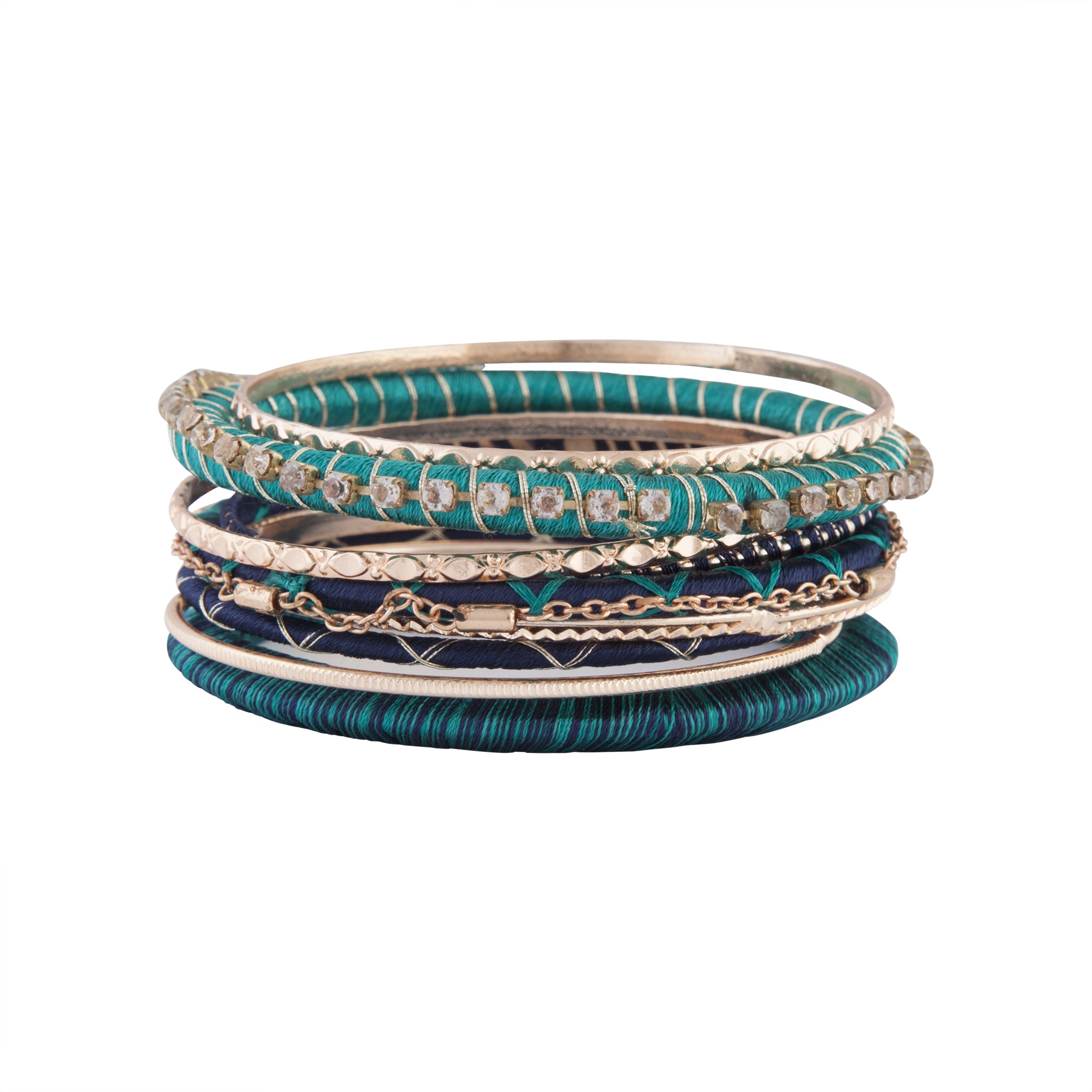 A variety of green shades and textures are showcased through this bangle pack. Fabric, diamantes and textured gold toned finishes make this set ideal for layering.