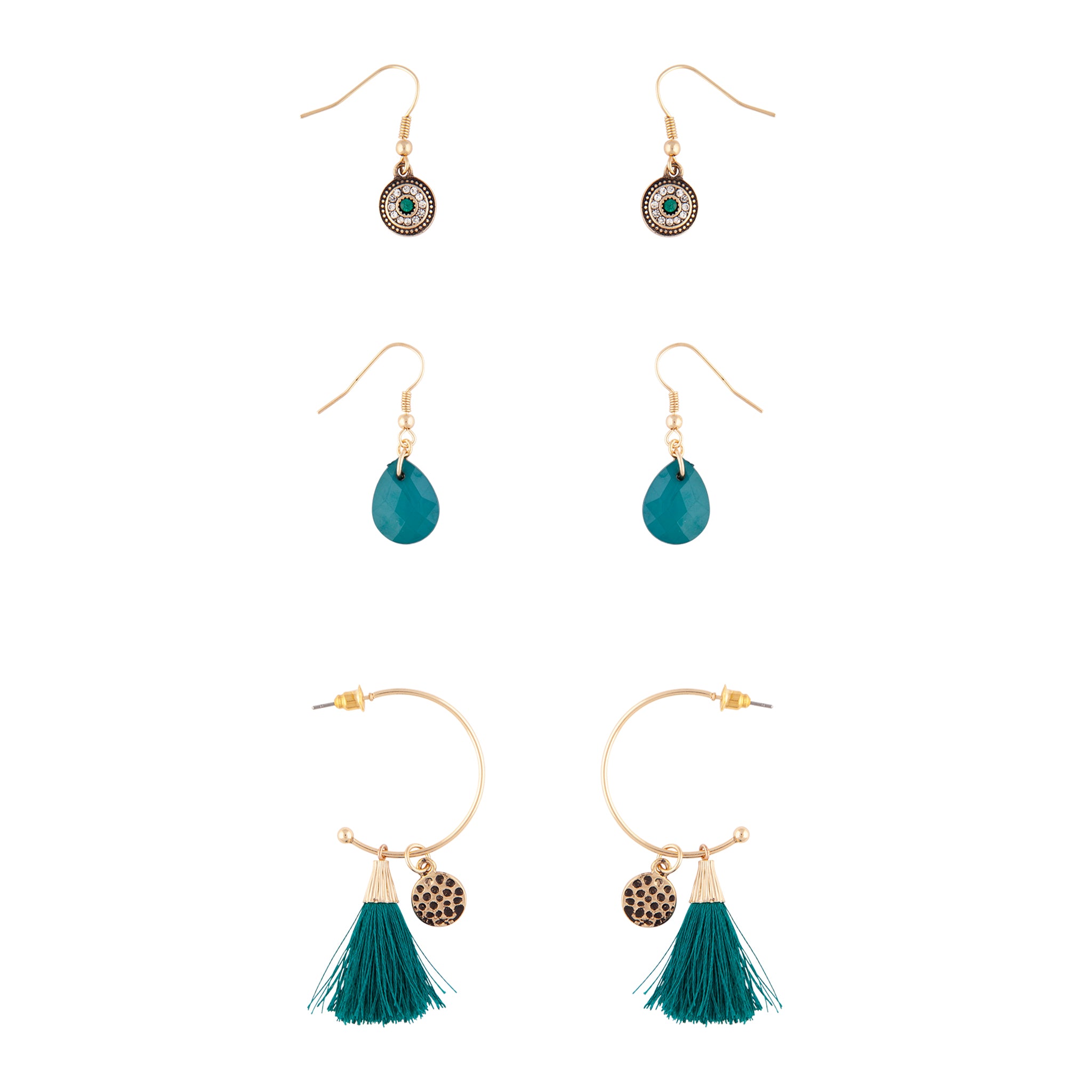 The options are endless with this 3 pack of antique-gold-toned earrings featuring one hoop earring with a green tassel, one drop earring with a diamante encrusted gold-toned plate and one drop earring with a green bead.