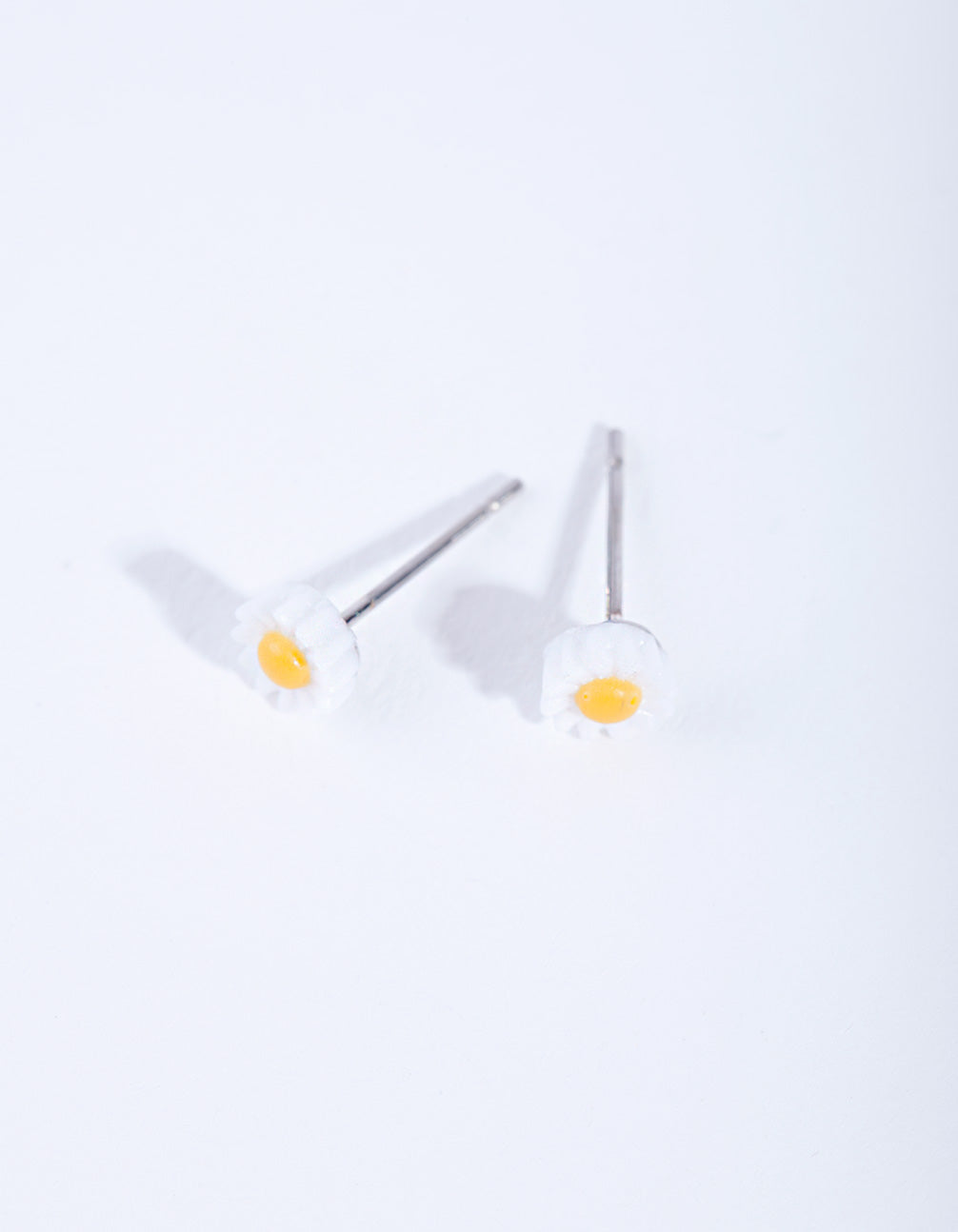 A pair of small stud earrings featuring a white daisy.