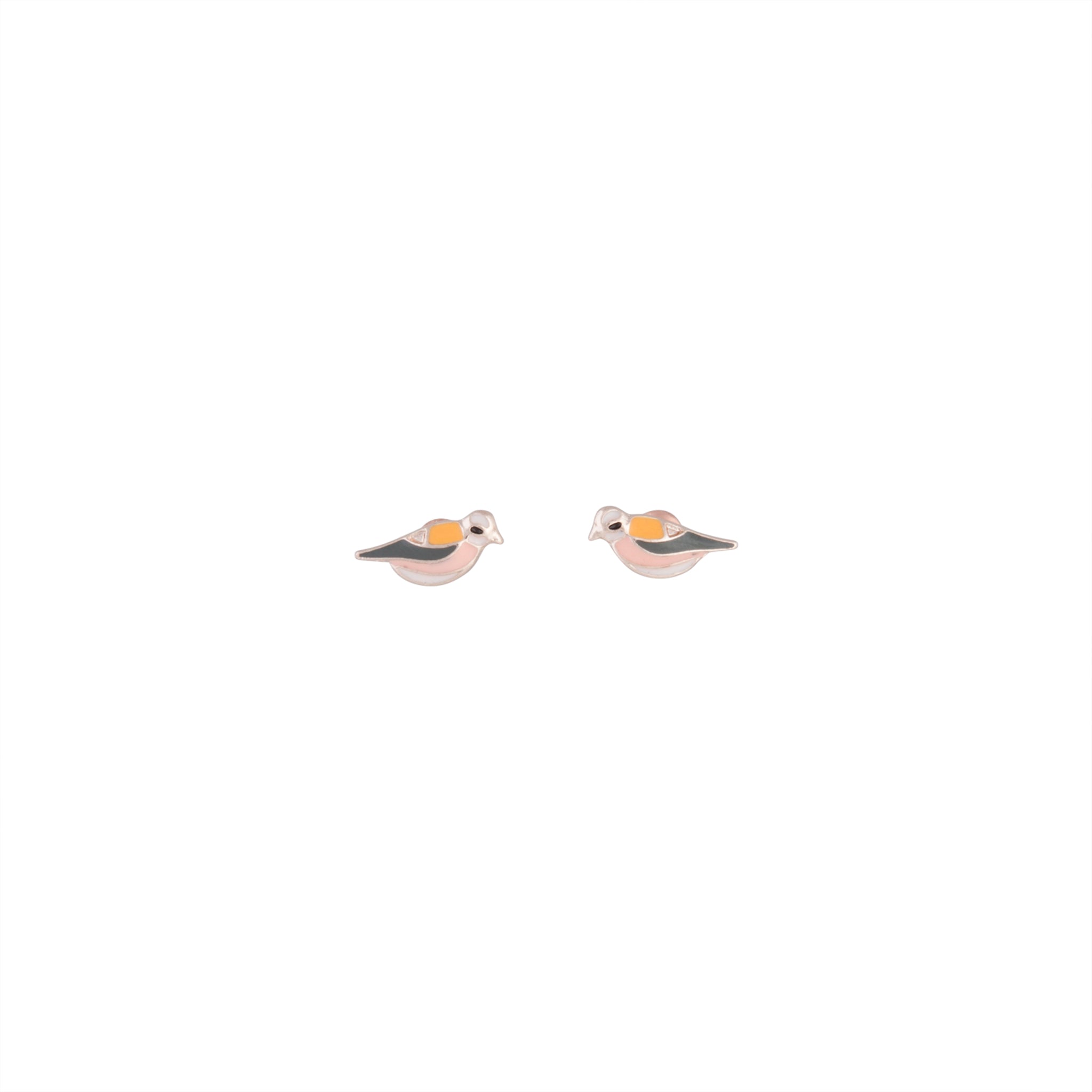 A pair of role gold toned bird earrings with orange and pink detailing.
