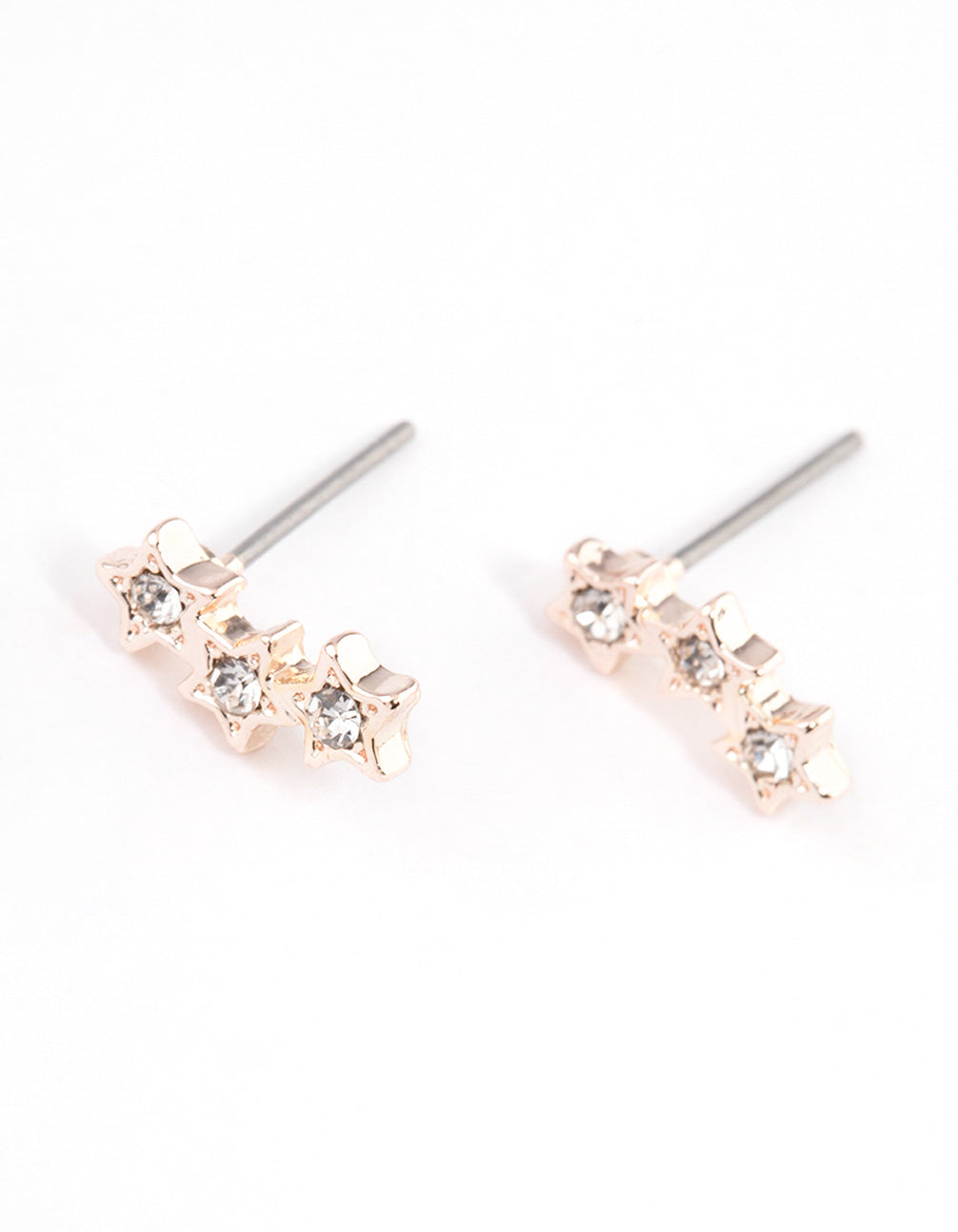 - This set of rose gold stud earrings features a crawling, celestial design with small star motifs.