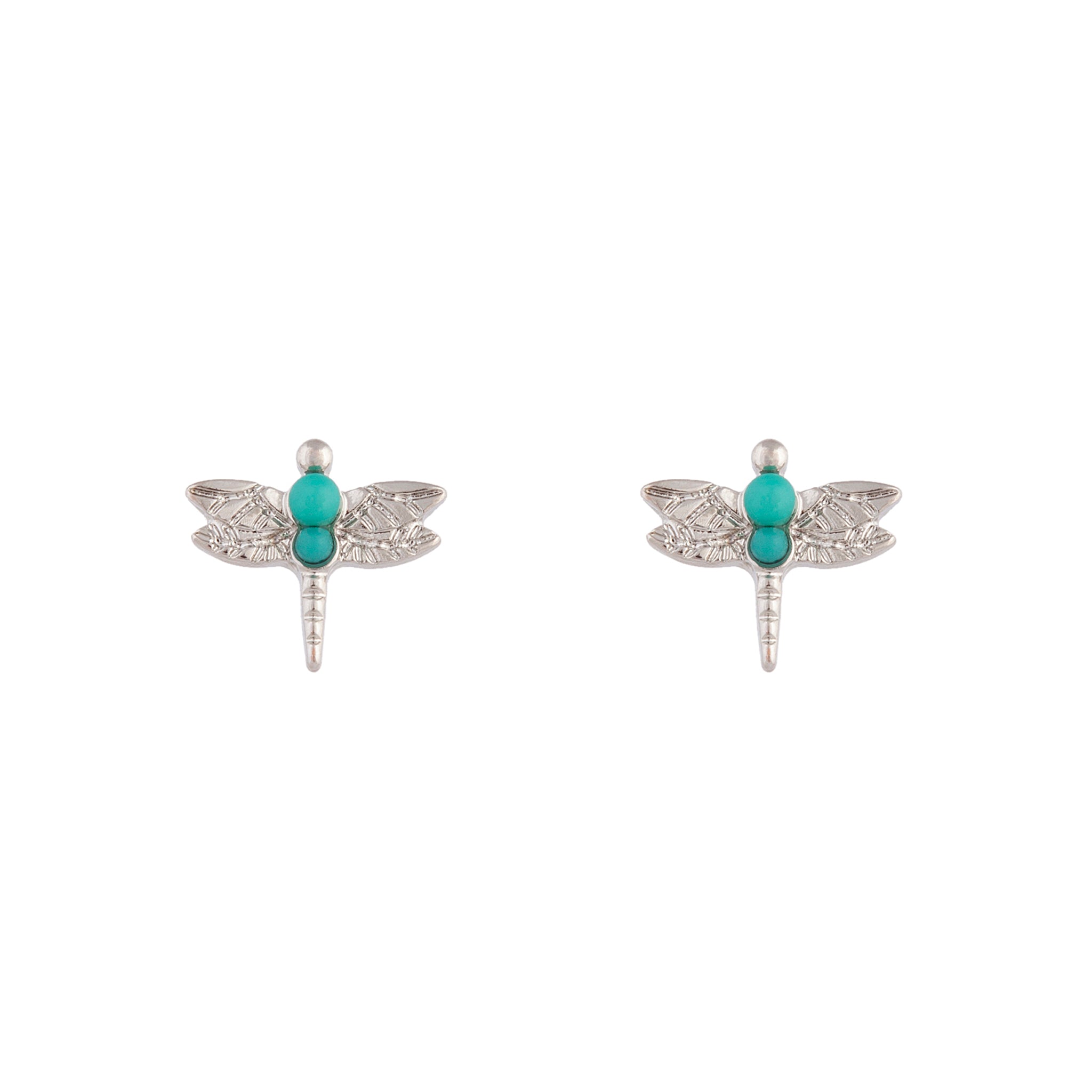 A pair of silver-toned stud earrings with a blue stone dragonfly design.