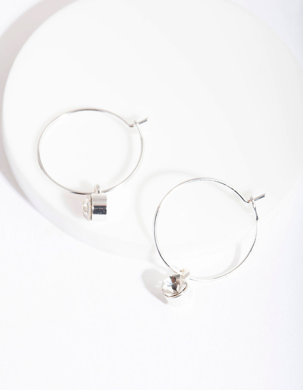 This silver tone earring boasts a hoop design with a crystal stone pendant.