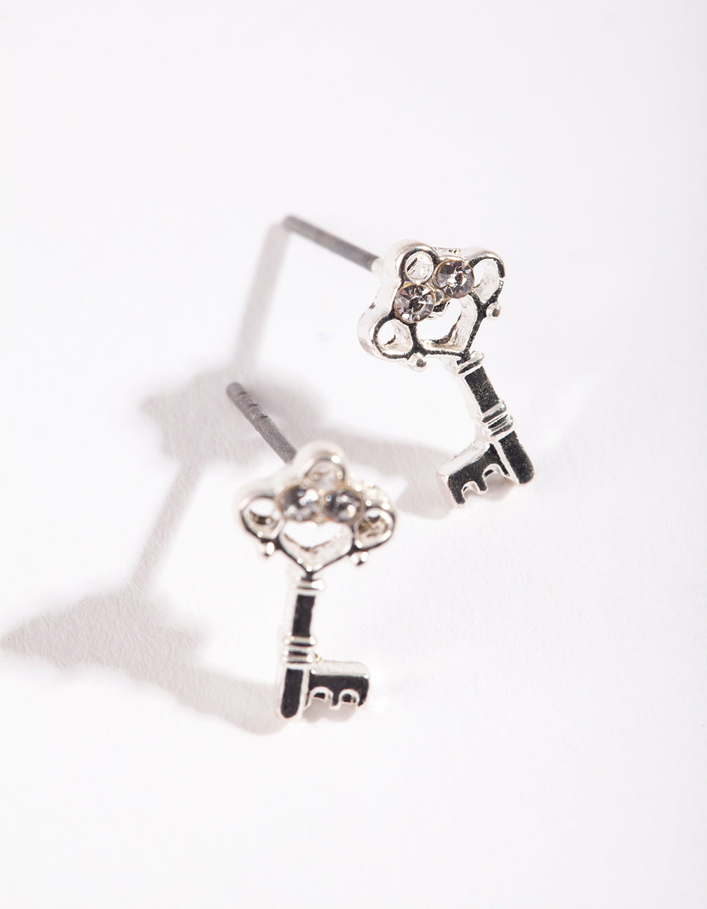Unlock your style with these Silver Diamante Mini Key Stud Earrings! Perfectly petite and oh-so-chic, these silver-tone earrings feature a delicate key design embellished with sparkling diamantes for a touch of glamour. Whether you're dressing up for a night out or adding a playful twist to your everyday look, these studs are a versatile jewellery must-have. Pair them with casual jeans and a tee for a subtle sparkle, or wear them alongside a sleek dress for added charm. Ideal for anyone who loves unique earrings with a hint of elegance, these mini key studs are the perfect finishing touch to any outfit.