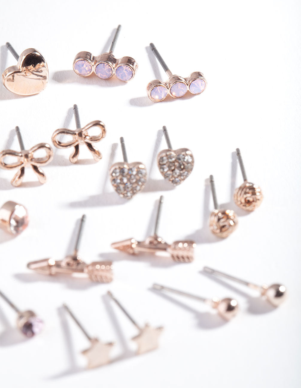 You'll always find the perfect pair with this earring 12 pack. The styles in this pack come with a rose-gold-toned setting and a variety of feminine designs.