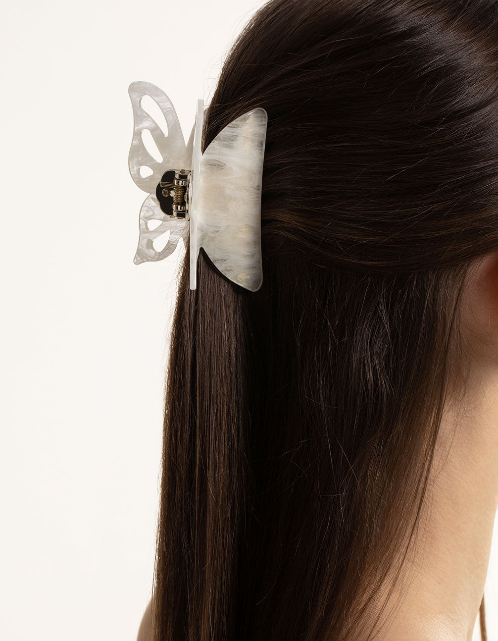 Embrace 90s trends with funky hair claws! This one is fairly large (measuring 8cm in length) and boasts a lovely, butterfly design. It's a gorgeous, silvery colour with a pearlised, shiny effect. This is the perfect piece to transform a plain hairstyle into a chic trend-driven look.