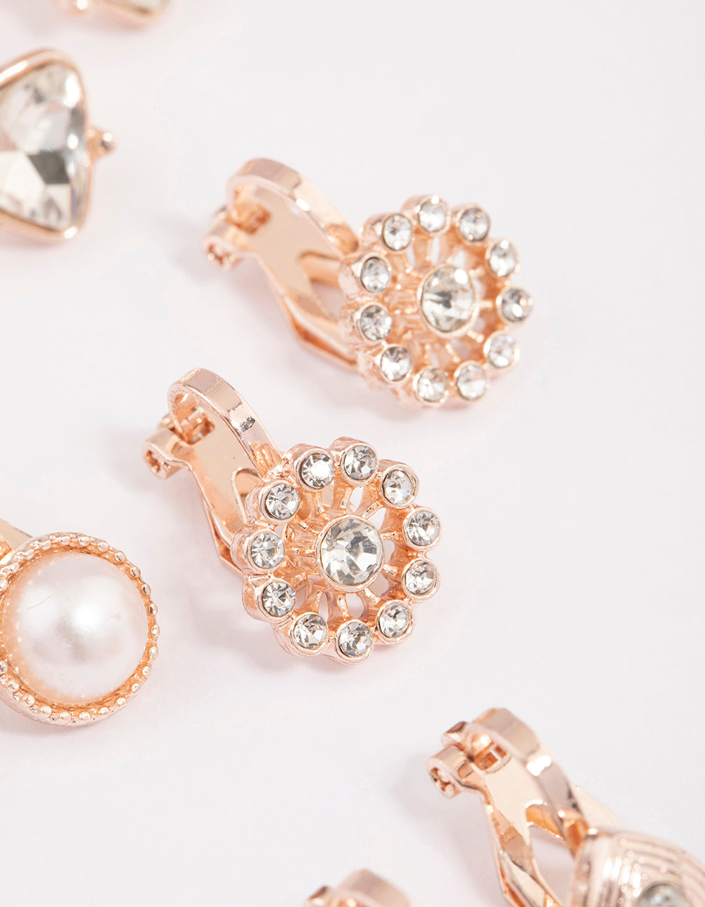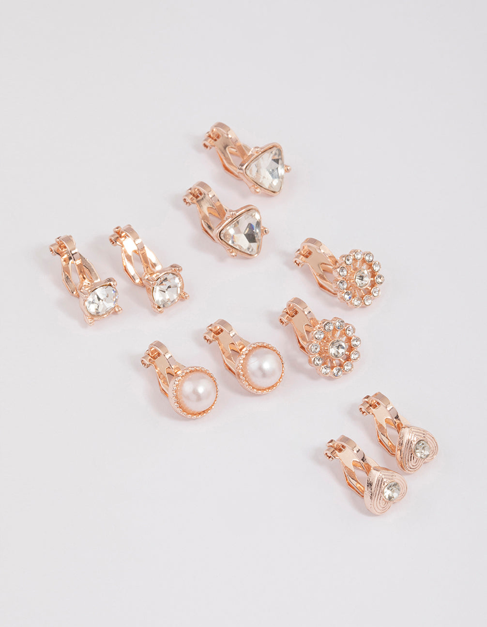 Rose Gold Heart & Flower Clip On Earrings 5-Pack
