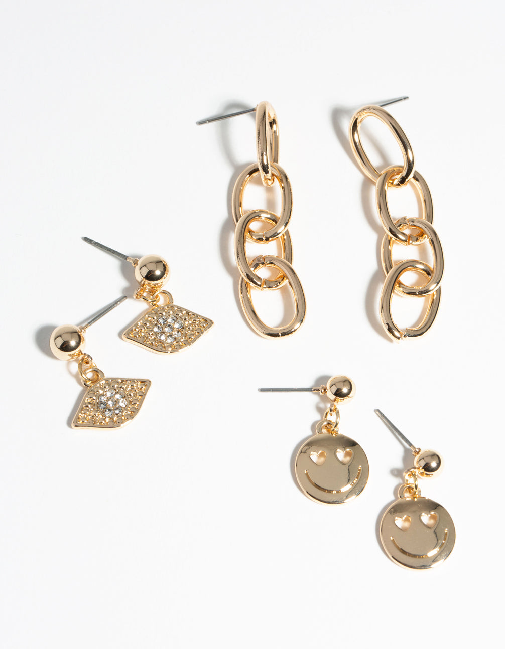 Add to your stud collection with styles that make you smile! This earring pack features three sets of earrings which all boast different designs: a drop chain, and evil eye and a smiley face. They're perfect for stacking, or go for a considered look and wear them on their own.