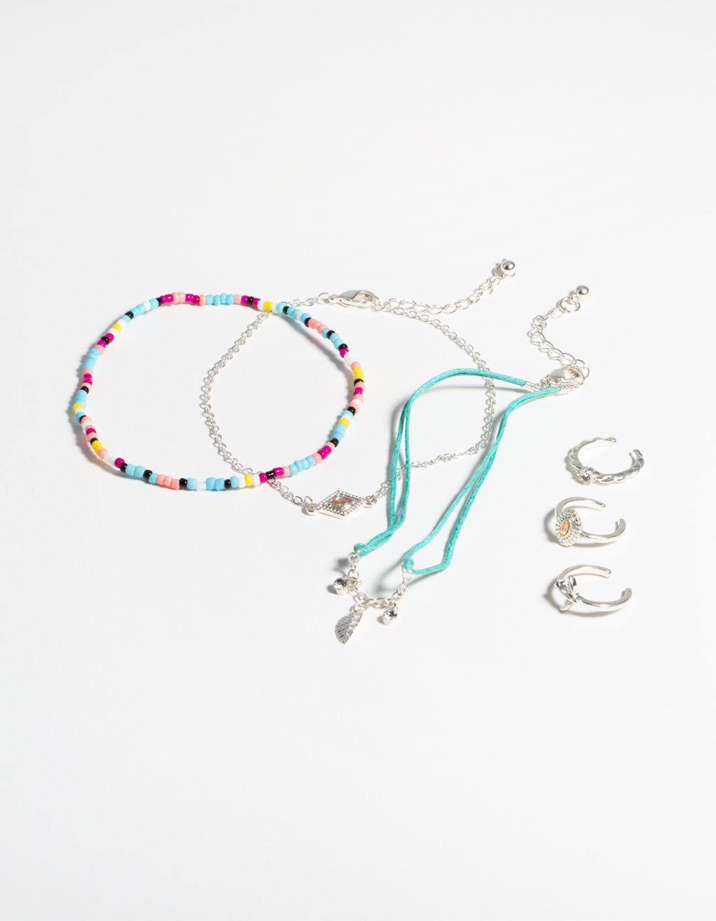 Add some festival fun to your outfit with this funky jewellery set. It includes two silver-toned anklets, a bright beaded bracelet and three toe rings to add extra shine.