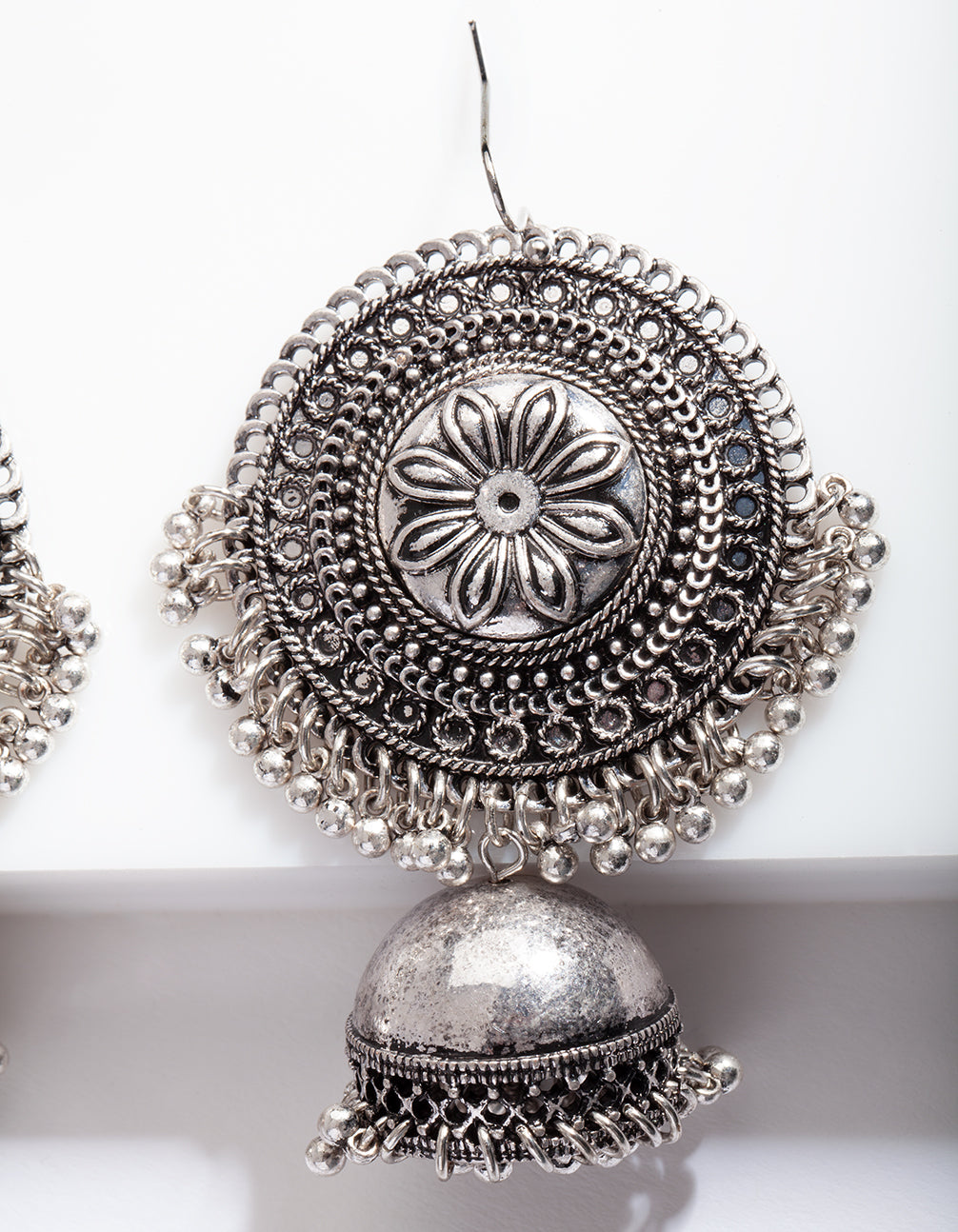Statement earrings have become the easiest way to switch up any wardrobe. These antique silver-toned earrings boast detailed hanging elements.