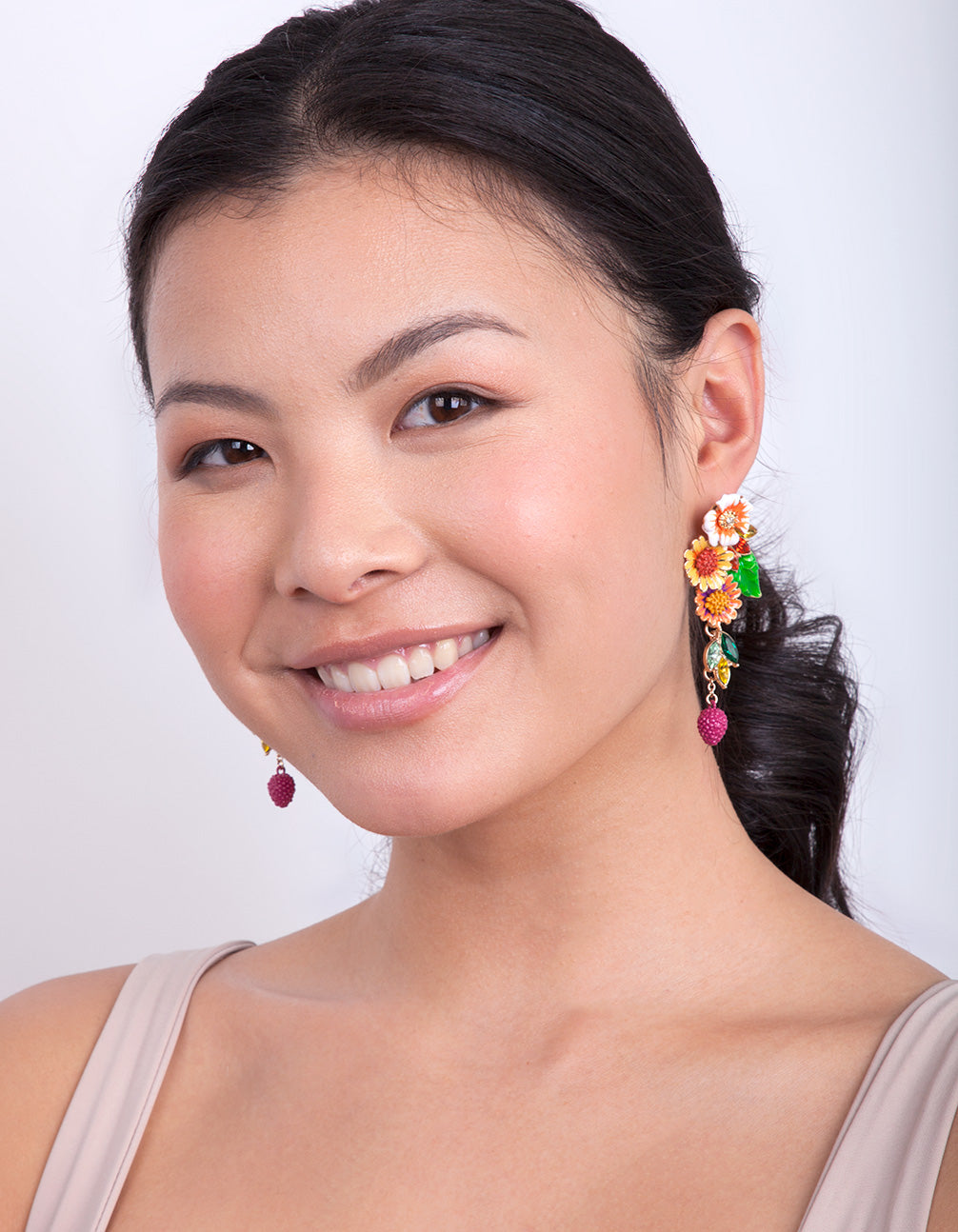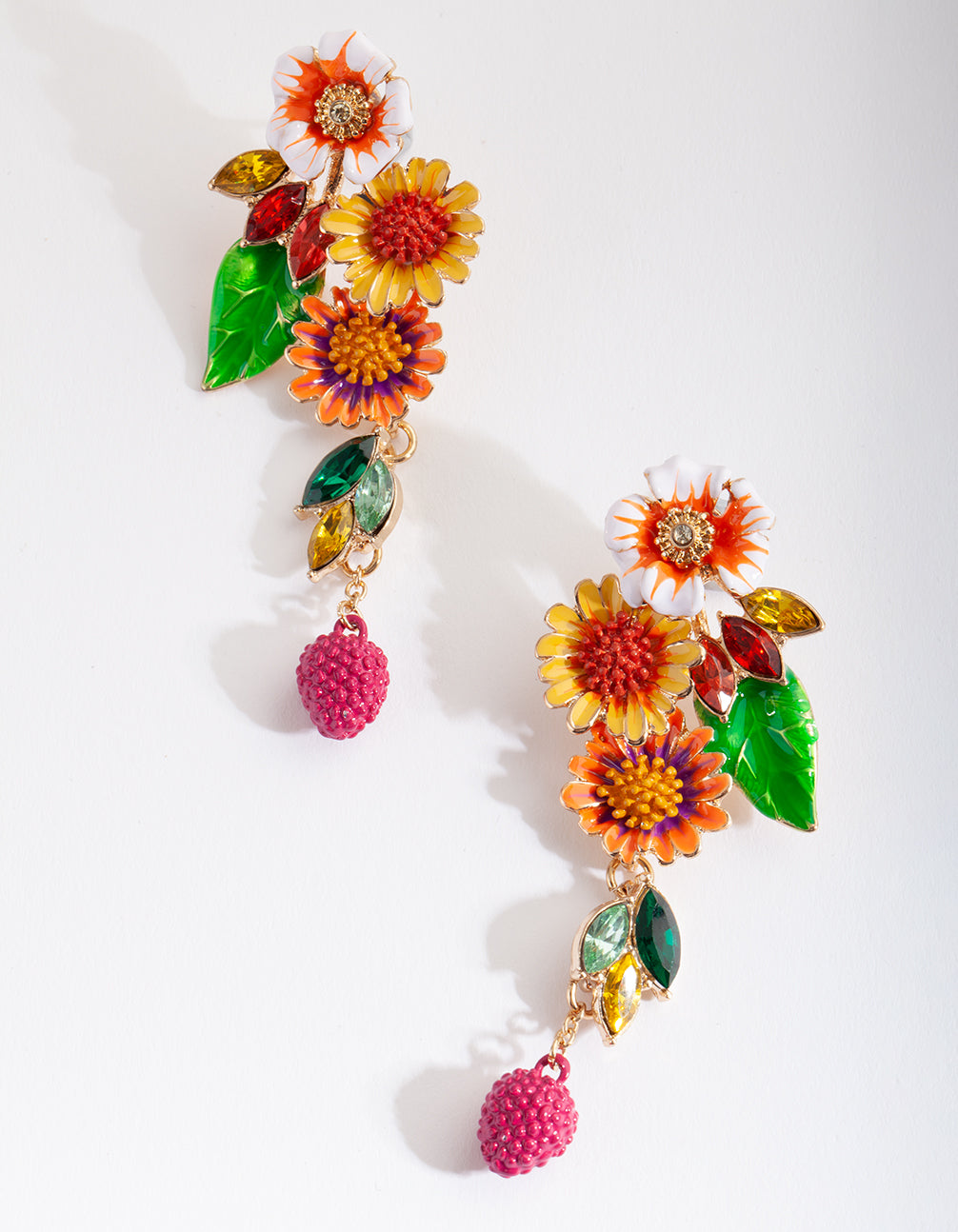 A fun pair of fashion earrings are an easy way to spice up your daily ensembles! These statement earrings boast a multi-coloured design with fruit and floral motifs