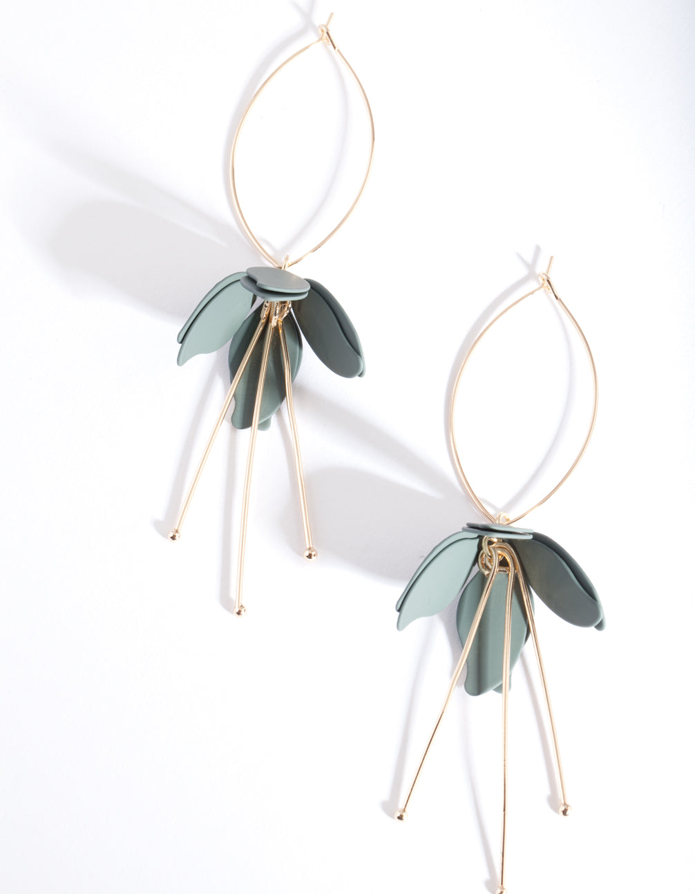 Statement earrings have become the easiest way to switch up any wardrobe. These earrings feature a thin gold-toned matte muted green flower drop earring. The long drop of these gorgeous earrings mean that they will just skim above your collarbone. Style with dainty gold accessories for a delicate finish.