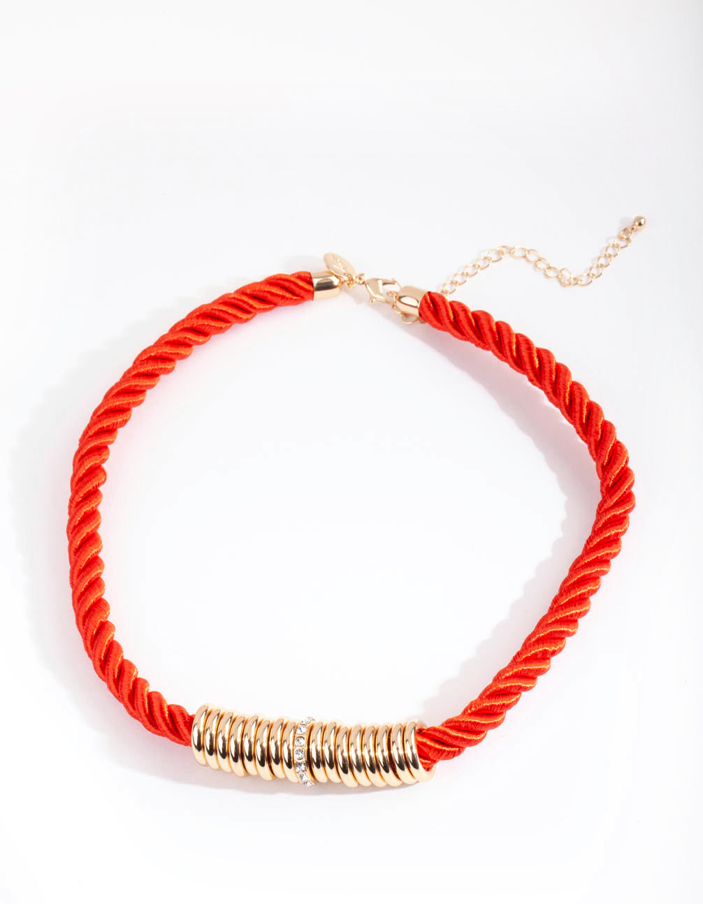Complete your daily edits with our fun everyday neckwear range. This necklace boasts a red twist rope design with diamante embellished ring details in a gold tone.