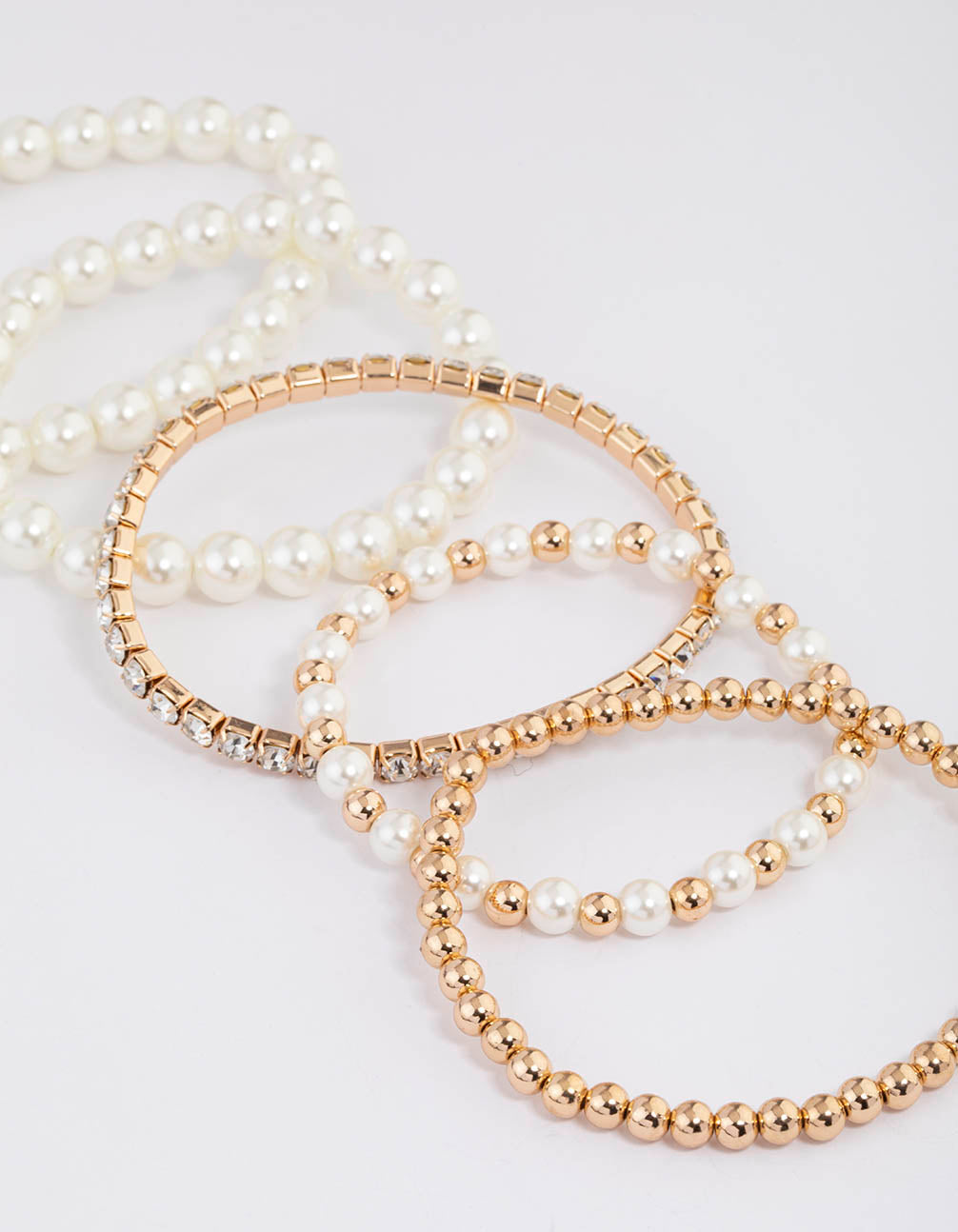 Gold Mixed Diamante Pearl Stretch Bracelet Pack