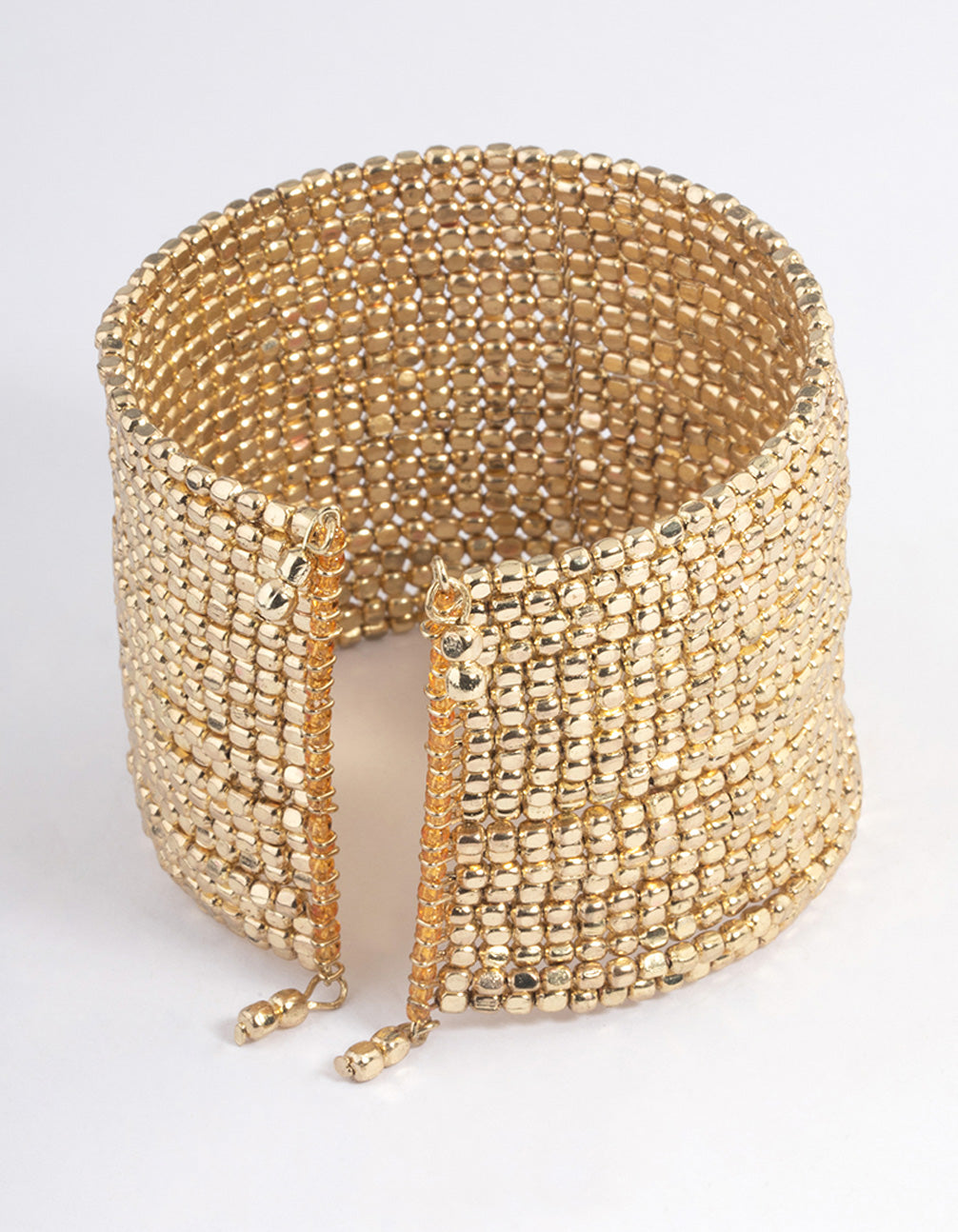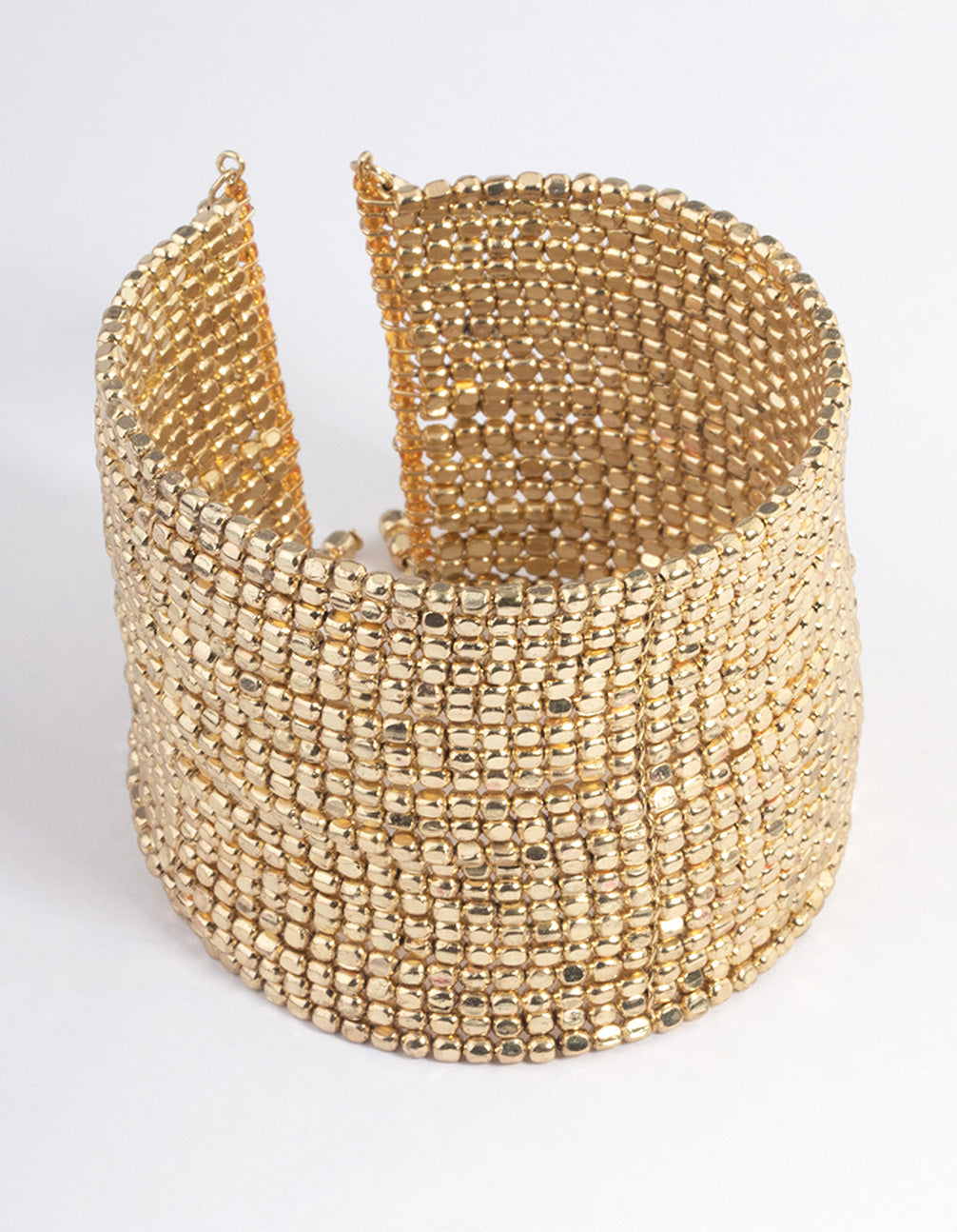 Elevate your accessory game with the Gold Small Beaded Wrist Cuff, a chic and versatile piece that can be worn on its own or stacked with other bracelets for a layered look. This bracelet cuff features delicate beading for an intricate look.