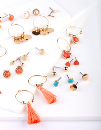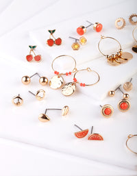 Can't decide on just one? You don't have to! This style features a variety of earrings so you can mix and match to suit your mood. This large earring pack of 20, comes in gold-tone studs and hoops with splashes of coral and turquoise in a mixed fruit design.