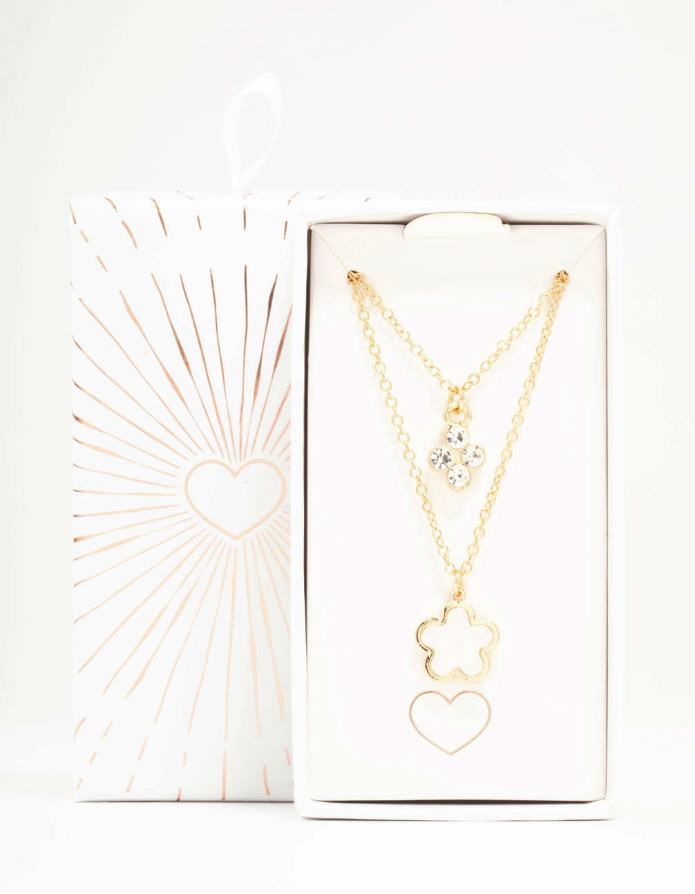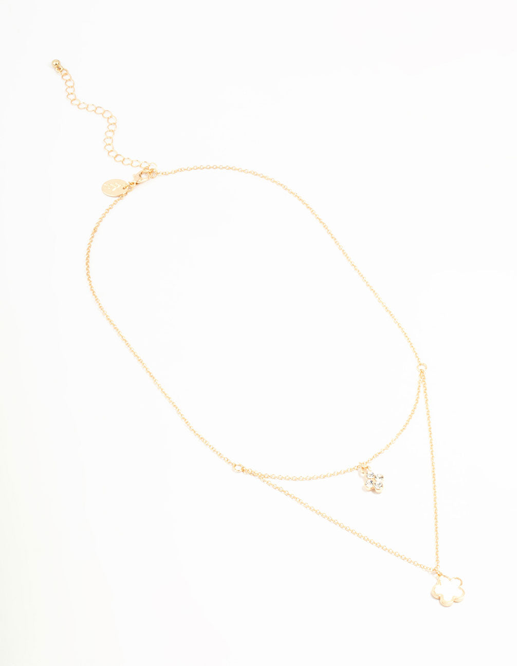Surprise someone special with this beautiful layered necklace. It features one layer with a crystal flower pendant and another with a white flower pendant. With its elegant gold-tone finish, this versatile piece enhances any outfit.