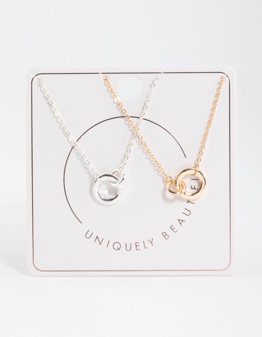 Elevate your jewellery game with the Mixed Metal Diamante Link Circle Necklace 2-Pack, featuring two stunning necklaces with diamante-studded, interlocking circles. This set comes beautifully wrapped in a Lovisa gift box, making it the perfect gift for someone special or for spoiling yourself.