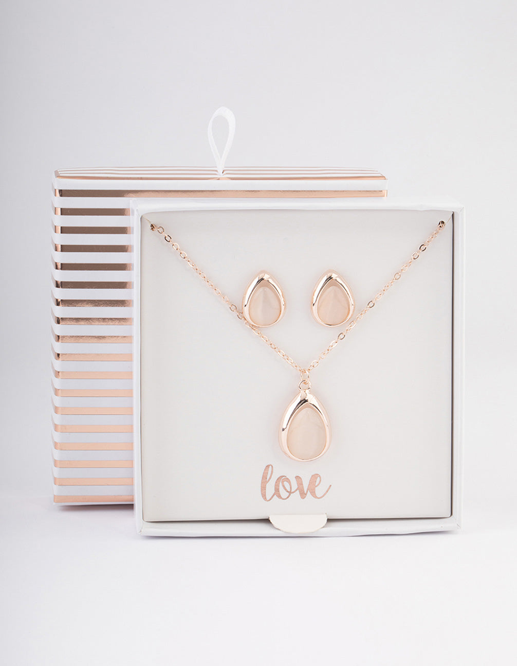 - This gift box ccontains a rose gold jewellery set. The perfect gift to spoil your loved ones.