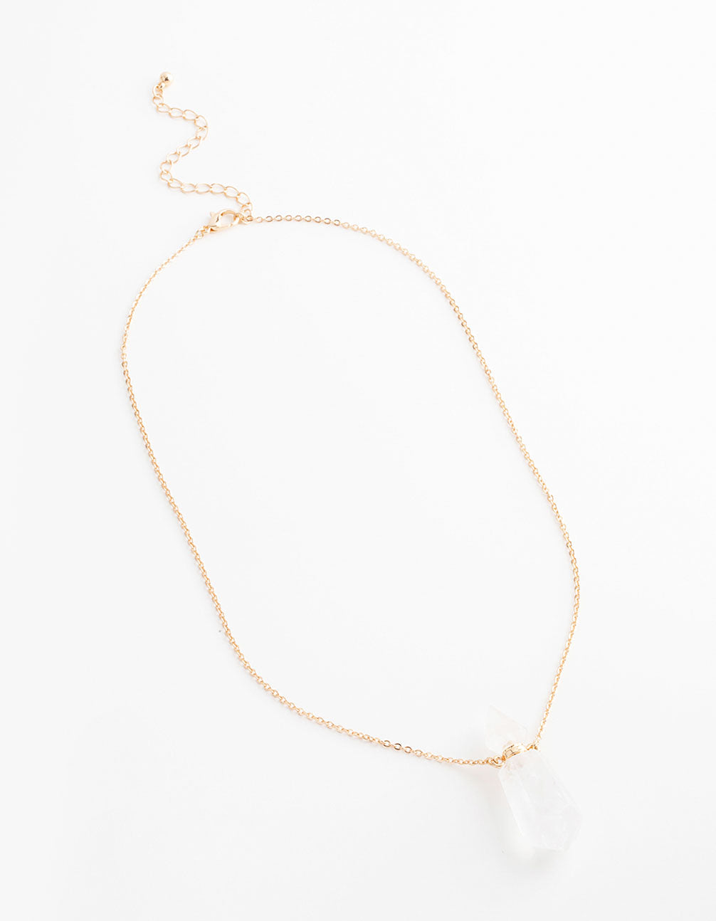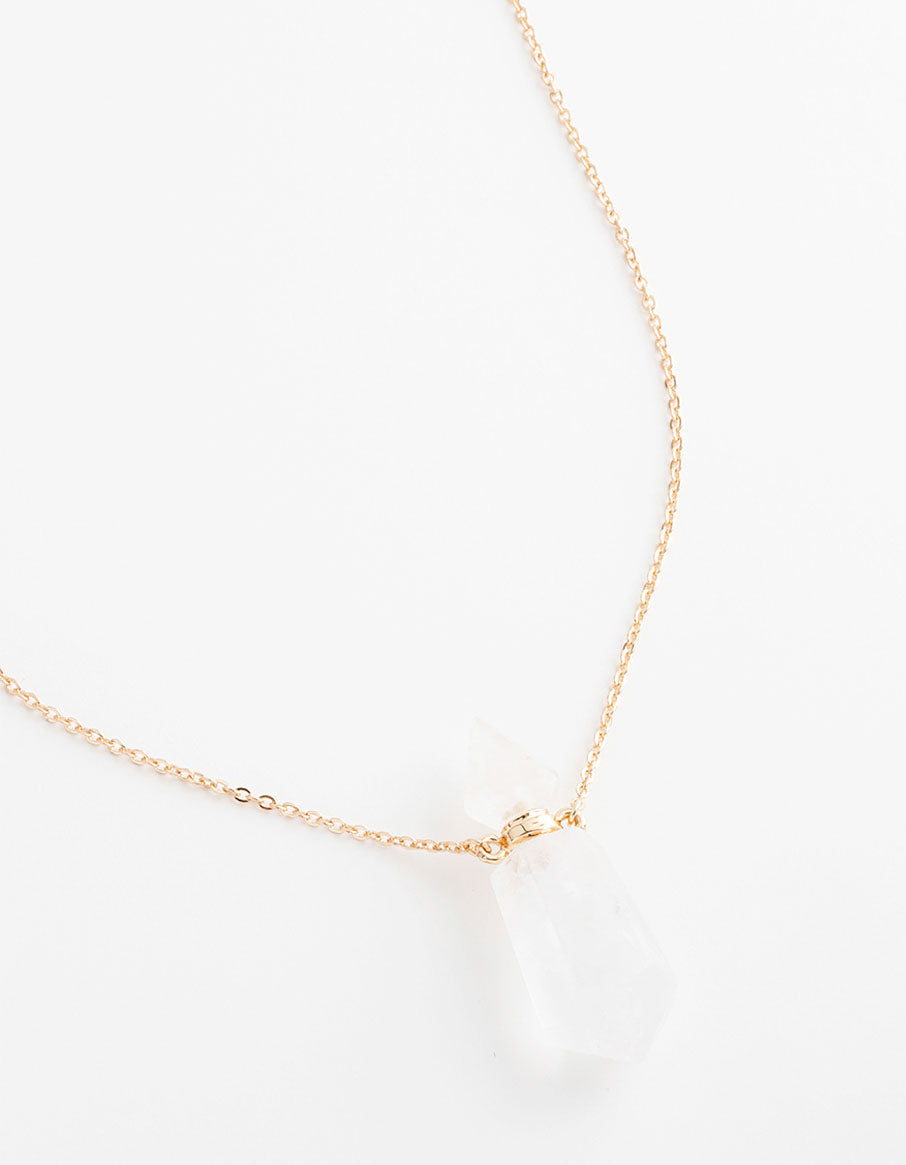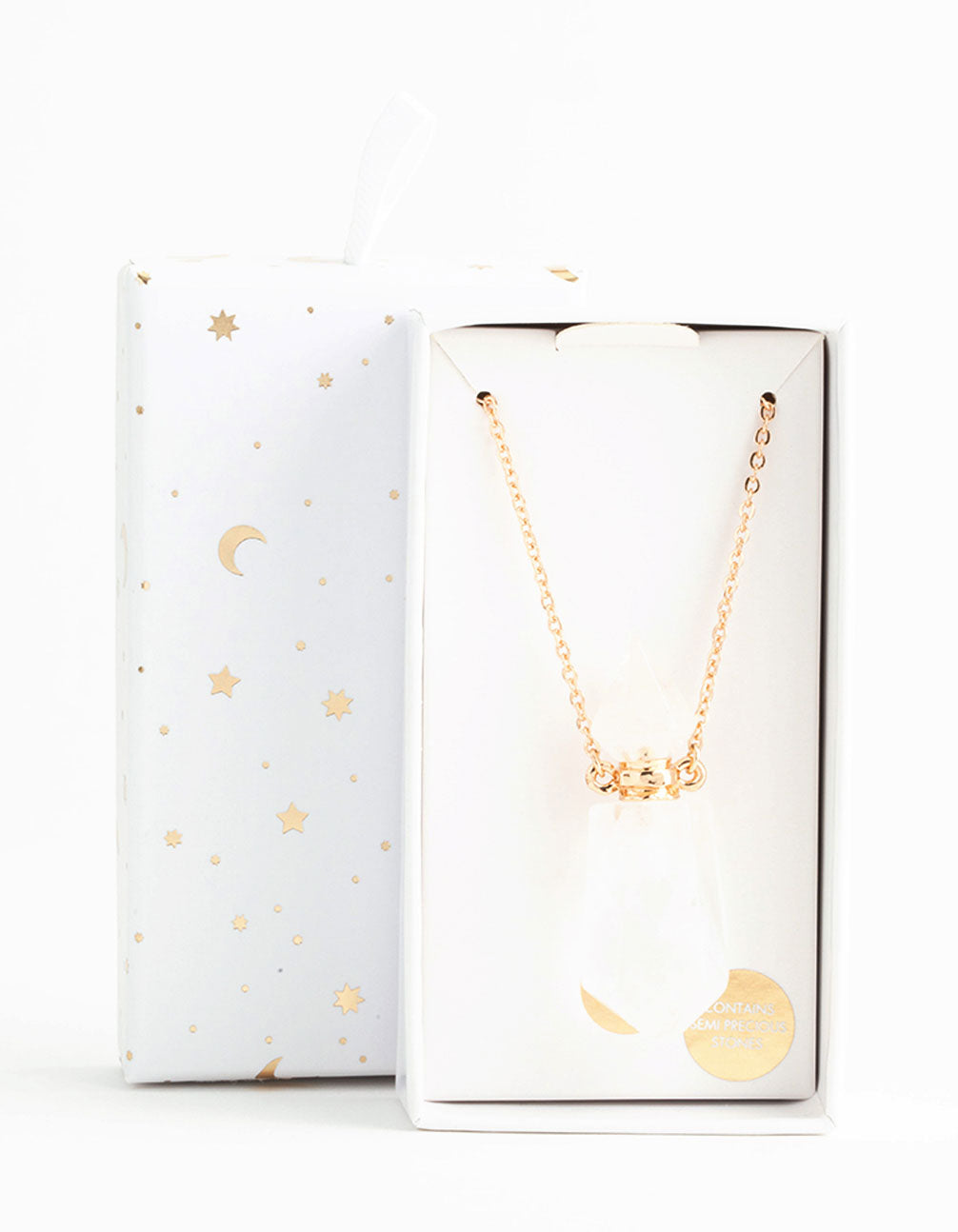 This gift box contains a gold-toned necklace with a clear quartz crystal pendant for a unique finish.