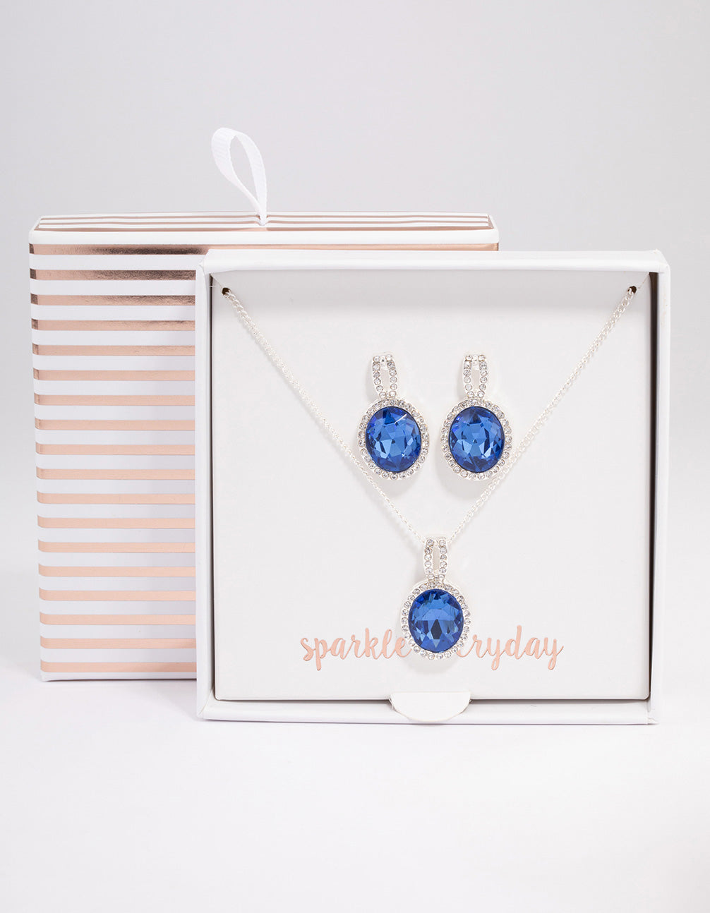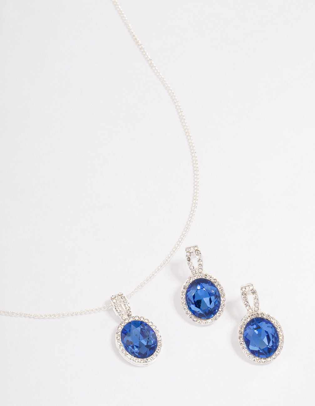 Silver Oval Blue Halo Necklace & Stud Earrings Jewellery Set