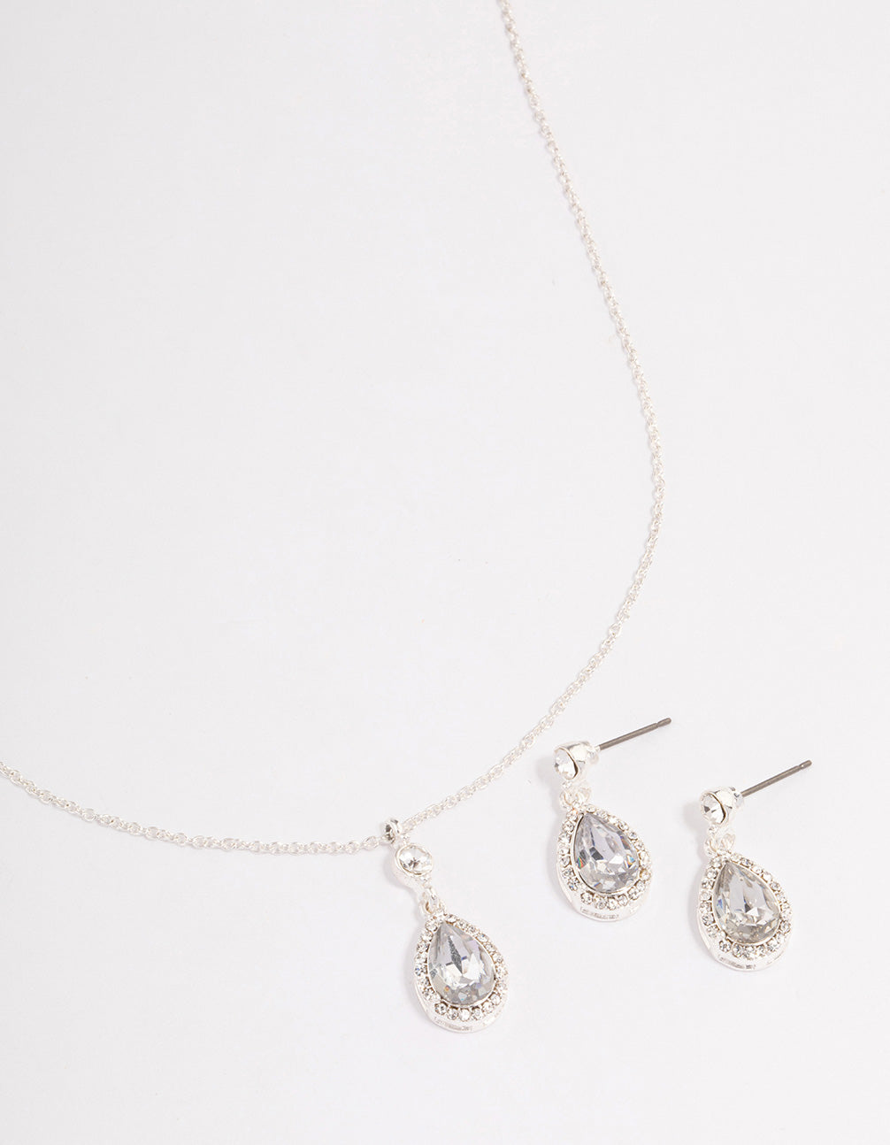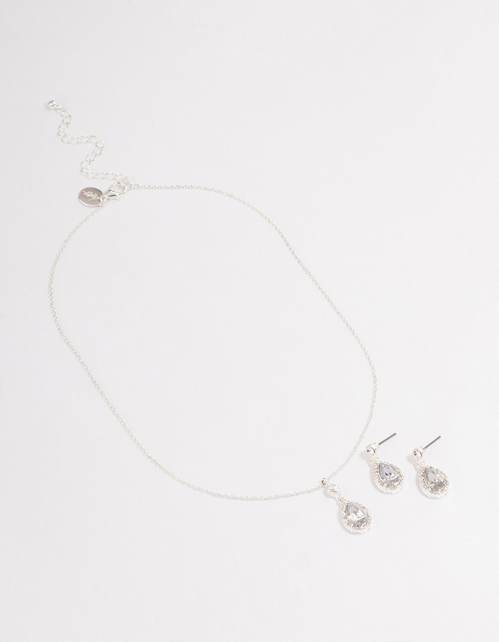 Spakle every day with this timeless, silver jewellery set. This set contains a teardrop pendant necklace and pair of dazzling drop earrings to match.