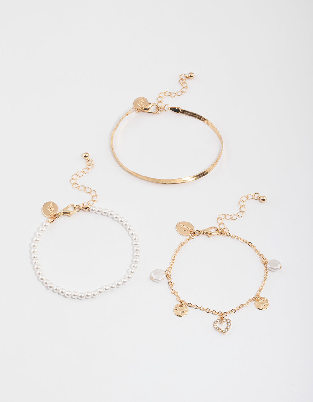 Style this gold-toned, pearl and heart charm bracelet three pack with matching accessories from our Heart Edit for more.